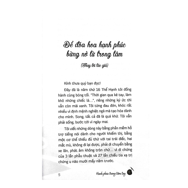Ở độ tuổi mà mọi người đã yên bề gia thất, con cái lớn khôn, tác giả Lê Dương Thể Hạnh, như bộc bạch của chị trong các trang sách, vẫn vui vẻ bên gia đình, cha mẹ, vẫn tận hưởng cuộc sống theo cách của riêng mình, và để biết rằng, ngày nào còn thở trên cuộc đời này thôi đã là may mắn lắm rồi. Nhưng những điều mà chị muốn độc giả hướng đến không dừng lại ở đó.