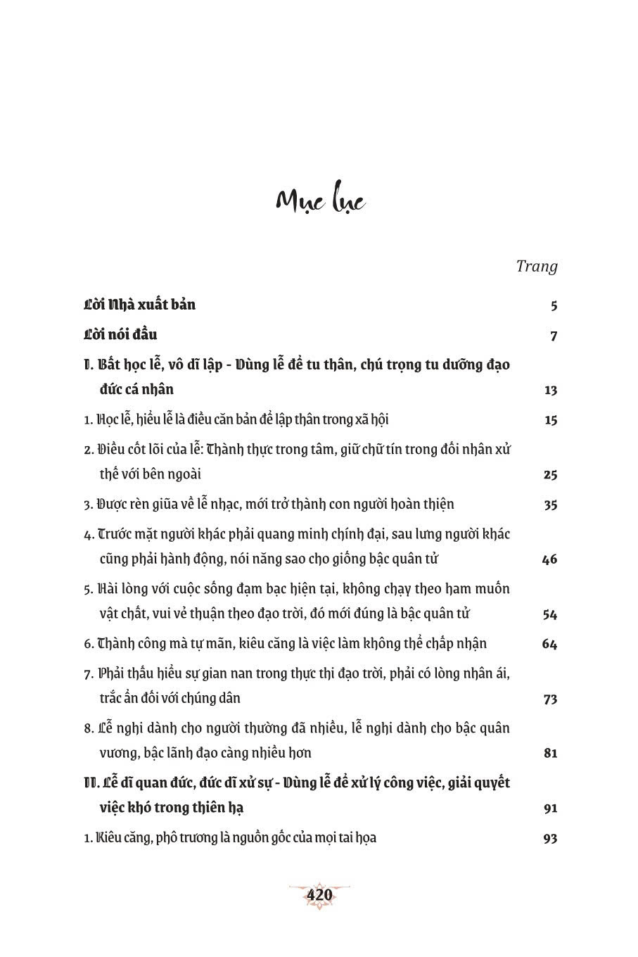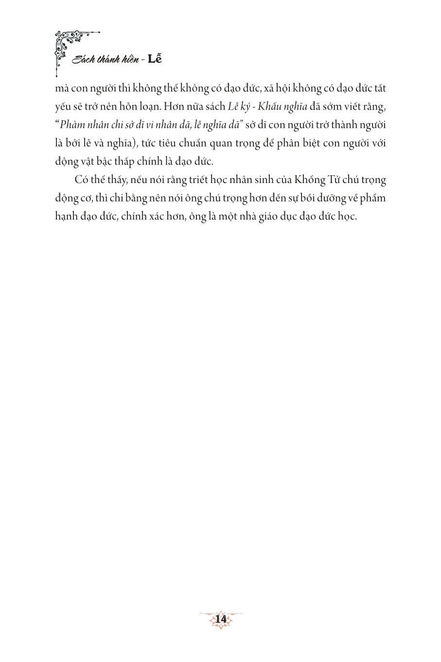 Để giúp bạn đọc có điều kiện nghiên cứu, tham khảo sâu hơn các giá trị đạo đức của Nho giáo, Nhà xuất bản Chính trị quốc gia Sự thật tái bản, có sửa chữa ba cuốn Sách thánh hiền - Nhân, Lễ, Nghĩa, hai cuốn Sách thánh hiền - Trí, Tín của bộ sách này hiện đang được tổ chức biên dịch, xuất bản và sẽ sớm ra mắt bạn đọc. Bộ sách được Nhà xuất bản Văn nghệ Trường Giang (Trung Quốc) phát hành năm 2011. Cuốn Sách thánh hiền - Lễ do hai tác giả Hạng Cửu Vũ và Chiêm Dật Thiên chủ biên, nội dung đi sâu phân tích vai trò và ảnh hưởng của "Lễ trong việc tu dưỡng phẩm chất đạo đức cá nhân, giúp con người quy chuẩn lời nói, cử chỉ, cách đối nhân xử thế trong các mối quan hệ, tình cảm,... Mặc dù dịch giả và Nhà xuất bản đã có nhiều cố gắng, nhưng do tính chất của loại sách kinh điển hàm chứa những giá trị lớn về các phương diện lý luận và thực tiễn, trích dẫn nhiều điển tích cũng như đề cập mảng kiến thức rộng; ngoài ra, nội dung sách còn có phần phiên âm Hán - Việt, xuất hiện nhiều tên riêng, từ đồng âm khó tra cứu,... nên nội dung khó tránh khỏi sai sót. Bên cạnh đó, khi trình bày về các tư tưởng của Nho giáo, có một số quan điểm không còn phù hợp với xã hội đương đại, nhưng để bạn đọc thuận tiện nghiên cứu, tham khảo, chúng tôi vẫn giữ nguyên nội dung bản gốc. Rất mong nhận được những ý kiến đóng góp của bạn đọc để lần xuất bản sau cuốn sách được hoàn chỉnh hơn. Trân trọng giới thiệu cuốn sách với bạn đọc.