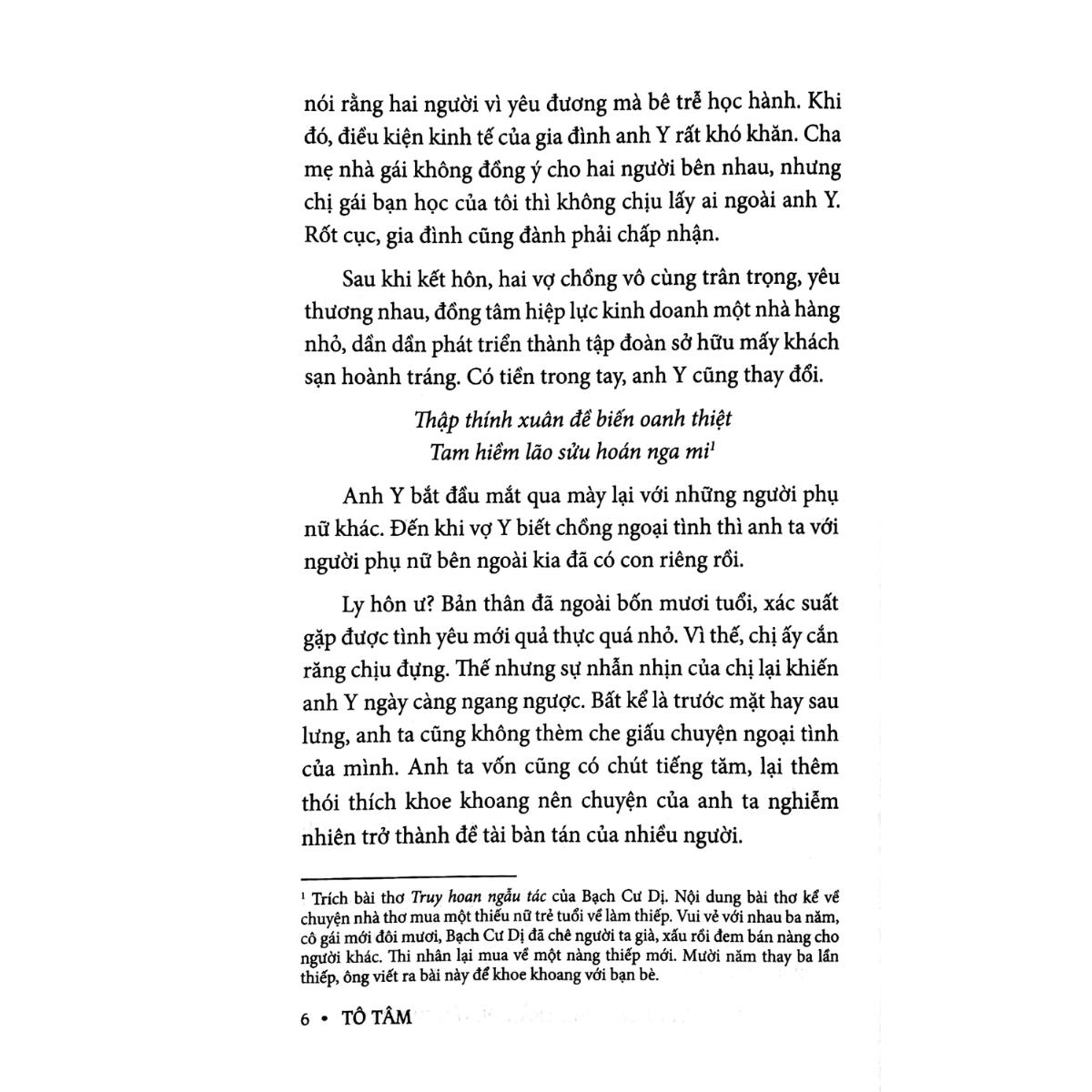 Thời Gian Bên Trái - Trần Duyên Bên Phải Đọc Thời gian bên trái, trần duyên bên phải, bạn sẽ bắt gặp mình trong câu chuyện của tác giả. Khi ở trong bất cứ mối quan hệ nào, dù là tình bạn, tình yêu, gia đình hay hôn nhân, chúng ta khó có thể tránh khỏi mâu thuẫn, tranh cãi hay tổn thương, mất mát. Nhưng qua lối hành văn, sự chia sẻ của Tô Tâm, bạn đọc sẽ cảm thấy như được lắng nghe và thấu hiểu.Đôi khi bạn không cần phải tôi luyện bản thân quá mạnh mẽ, cứng cỏi mới tránh được hết tổn thương chốn hồng trần. Đọc Thời gian bên trái, trần duyên bên phải, bạn sẽ hiểu hơn cách Tô Tâm ứng xử với đời, đặc biệt là "lấy nhu thắng cương". Mỗi câu chuyện, mỗi lời tâm tình của tác giả không mang đến cảm giác trịch thượng “dạy đời”. Cô như một người chị đã bước qua nhiều thăng trầm của cuộc sống, nhẹ nhàng khe khẽ dạy lại cho đàn em cách đối nhân xử thế, trân trọng người và yêu lấy chính mình.Khi phồn hoa lạc tận, năm tháng chảy trôi, những người lặng lẽ ôm ghì lấy bạn trong bóng tối y hệt ngày xưa, những người cùng bạn khóc, chọc bạn cười, những người nắm tay bạn khi bạn bất lực mới là vầng thái dương ấm áp, đẹp đẽ trong cuộc đời bạn. Còn chúng ta, chính nhờ tình nghĩa nồng ấm ấy nên mới có dũng khí giữa hồng trần trăm núi ngàn sông này, không sợ sệt, không kinh hãi mà vượt qua từng chặng, từng chặng đường. Chỉ nguyện khi tóc bạc da mồi, người vẫn ở bên tôi, tôi cũng ở cạnh người. Mời bạn bước vào những suy tưởng cảm nhận rất nhẹ nhàng bay bổng nhưng lại rất đời thường trong Thời Gian Bên Trái Trần Duyên Bên Phải! Tác giả: Tô Tâm, là một nữ tác giả nổi tiếng, sống ở miền Bắc Trung Quốc, tự truyền thông cho bản thân. Hăng hái nơi làm việc, yêu mến những con chữ, dù gió to có nổi, cả đời không buông lơi. Về công việc, cuộc sống, hôn nhân, phụ nữ, những điều Tô Tâm viết cũng chính là tiếng lòng của cô. 2H Books – Delivering Happiness 2H Books là công ty trực thuộc Công ty cổ phần văn hóa Huy Hoàng. Chúng tôi cung cấp các đầu sách uy tín, đã được chọn lọc trên thị trường.