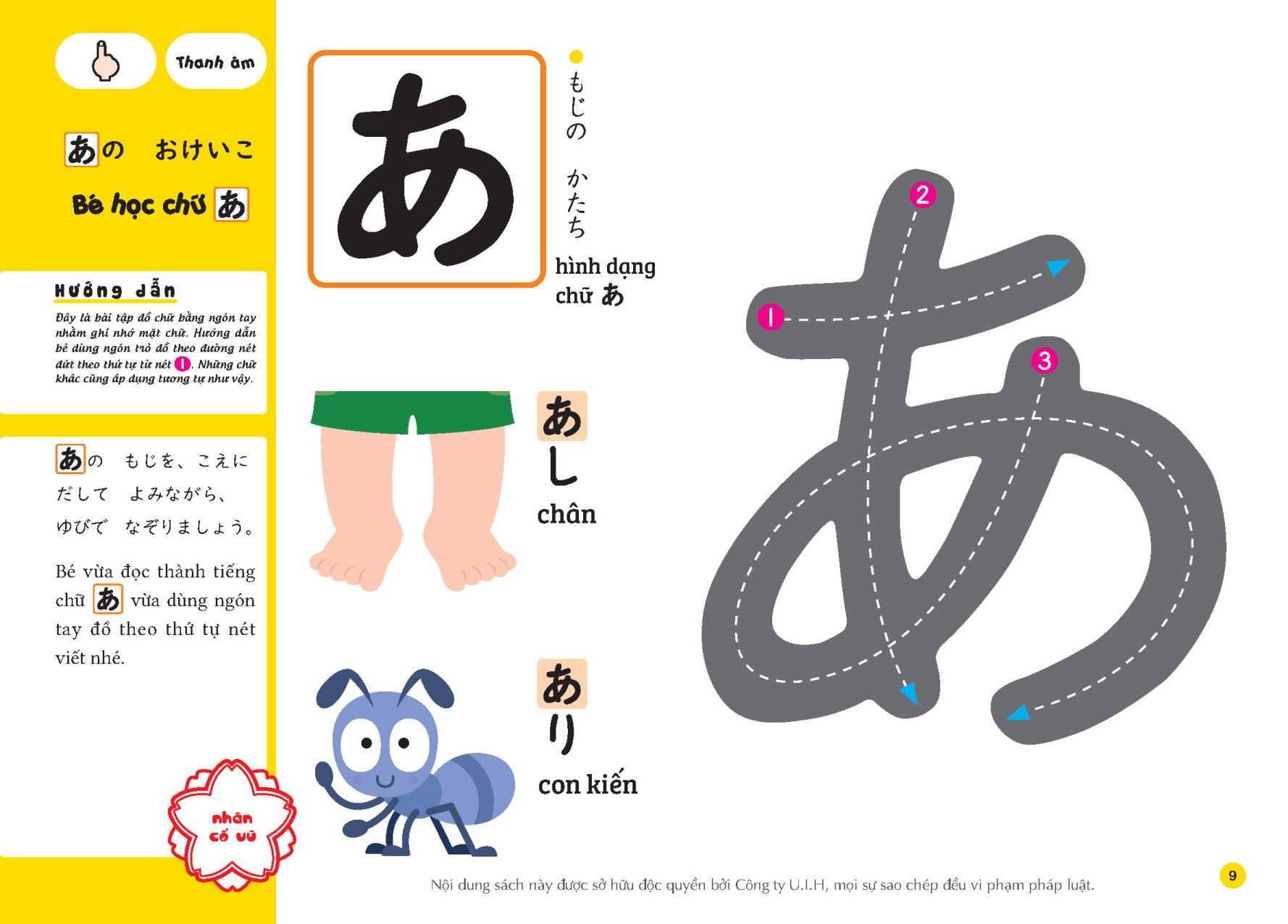 ☆ Ở độ tuổi nhi đồng, vốn từ vựng của trẻ đặc biệt là danh từ sẽ dần dần được tăng lên, trẻ cũng sẽ hứng thú nhiều với những từ có trong truyện tranh. Vui học Hiragana (4~6 tuổi) giúp trẻ nhận biết được chính xác những chữ cái Hiragana cỡ lớn một cách tự nhiên qua các bài tập như dùng ngón tay đồ theo 46 chữ cái Hiragana theo thứ tự, dùng bút sáp màu đồ chữ hay dán nhãn chữ cái tương ứng… Ngoài ra, trẻ còn được học thêm những từ vựng về các vật quen thuộc.