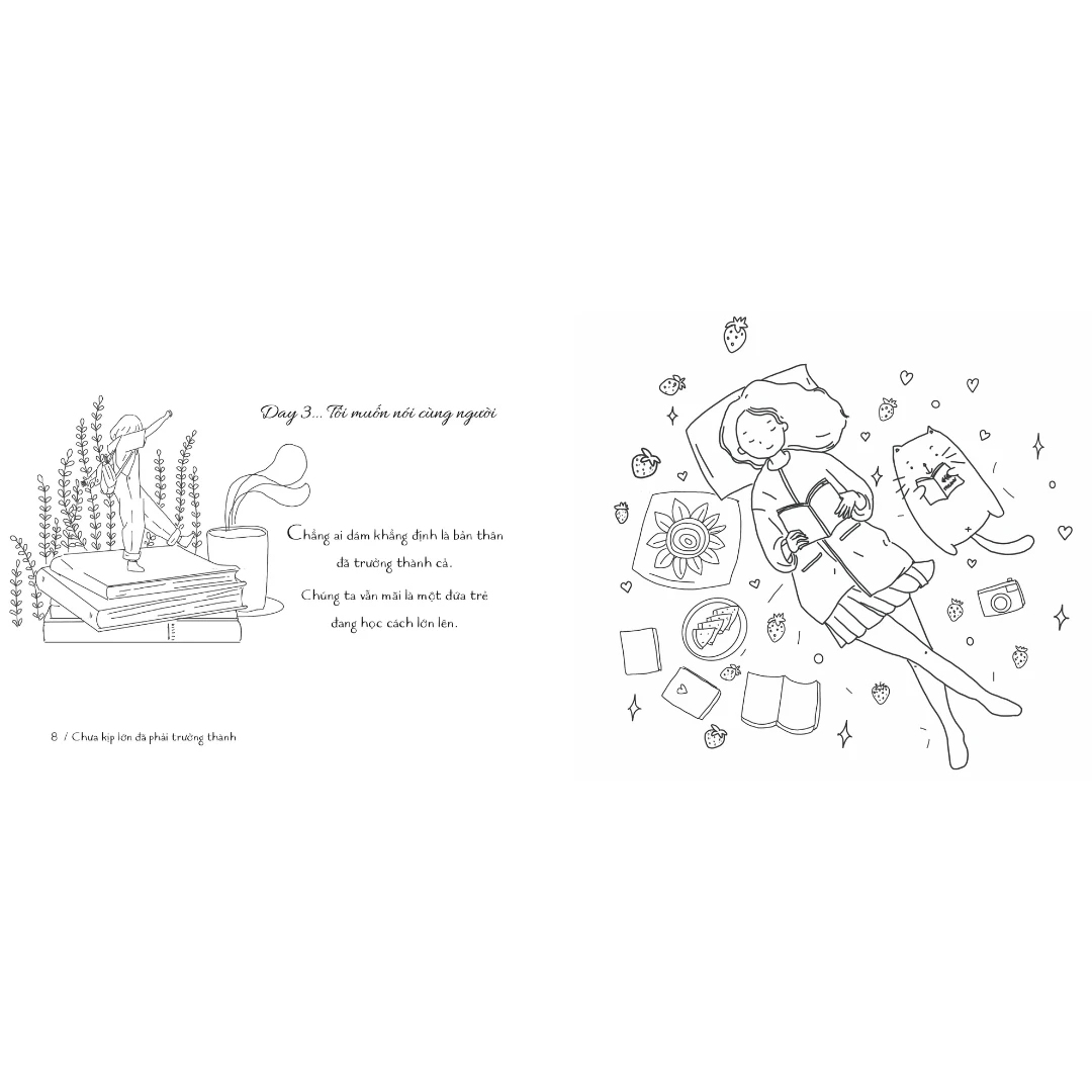 “Chưa kịp lớn đã phải trưởng thành” nay đã có phiên bản tô màu, kết hợp những lời tâm tình thủ thỉ với những bức tranh sinh động, dịu dàng. Cuốn sách như một món quà dành tặng bạn, để bạn tự tạo nên màu sắc tươi sáng tích cực, thỏa sức tô vẽ cảm xúc trên hành trình trưởng thành chênh vênh và ấp ôm bạn cùng đi qua những tháng ngày mỏi mệt.