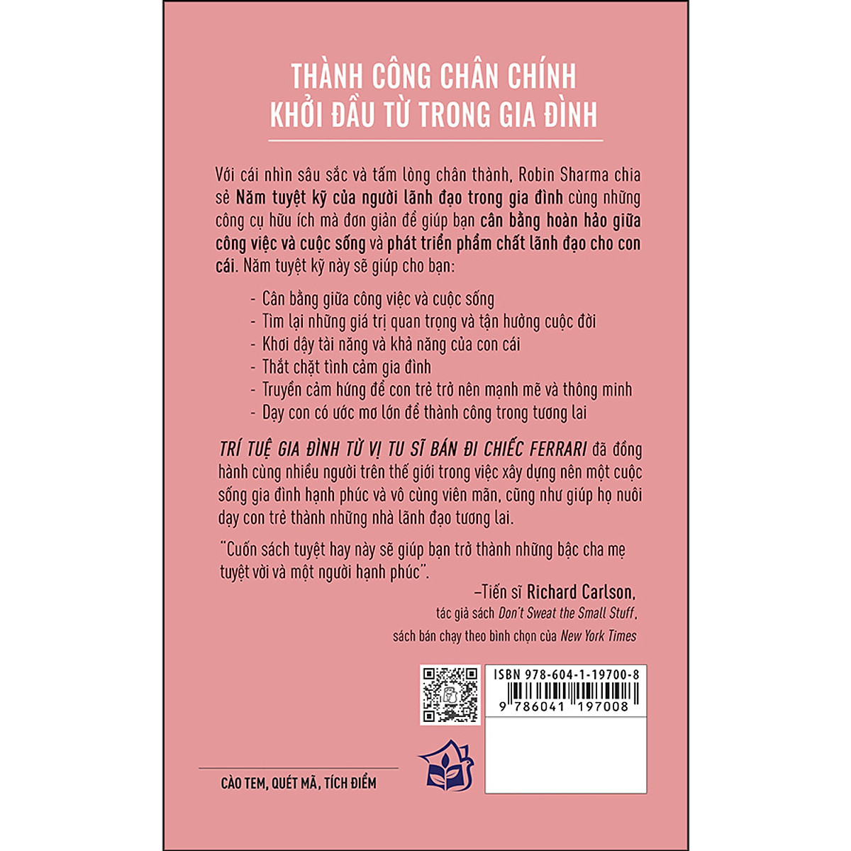 Trí Tuệ Gia Đình Từ Vị Tu Sĩ Bán Đi Chiếc Ferrari Thành công chân chính khởi đầu từ trong gia đình. Với cái nhìn sâu sắc và tấm lòng chân thành, Robin Sharma chia sẻ Năm tuyệt kỹ của người lãnh đạo trong gia đình cùng những công cụ hữu ích mà đơn giản để giúp bạn cân bằng hoàn hảo giữa công việc và cuộc sống và phát triển phẩm chất lãnh đạo cho con cái. Năm tuyệt kỹ này sẽ giúp cho bạn: