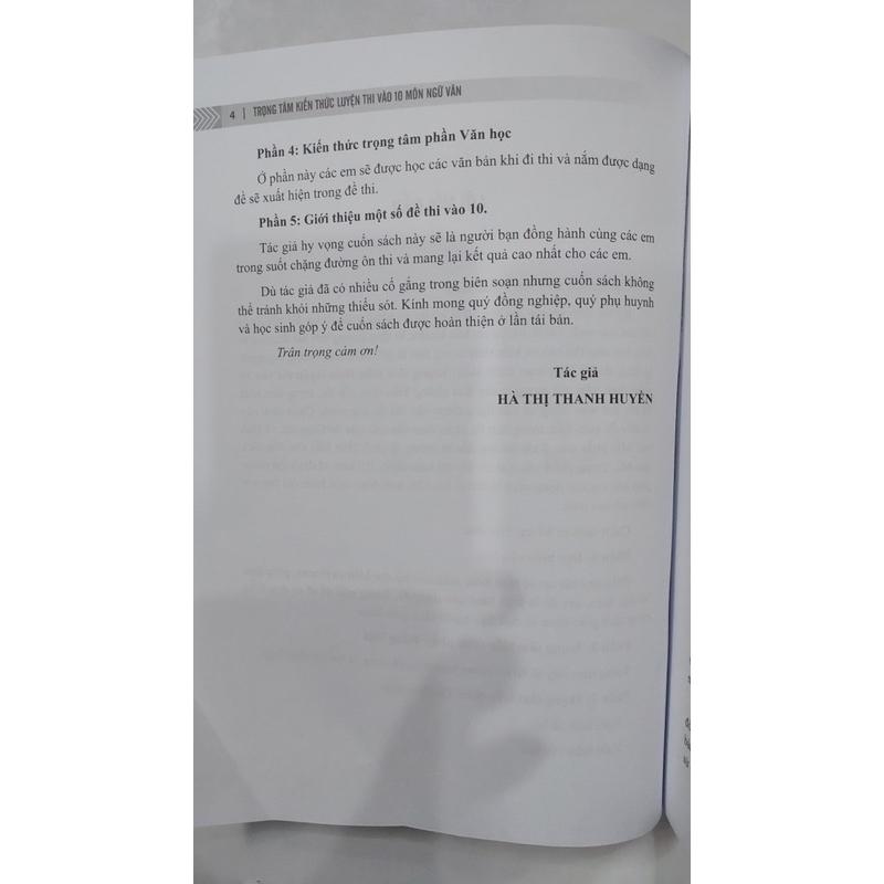 Nôi dung gồm có - Đọc hiểu văn bản: Có đầy đủ phương pháp nhận biết và cách làm bài giúp học sinh đạt điểm tối đa trong kì thi - Nghị luận xã hội: Đây là phần chiếm nội dung quan trọng và điểm số cao trong cấu trúc bài thi. Ở phần này có cấu trúc và cách làm một cách khoa học giúp cho mọi học sinh từ trung bình cũng làm được bài một cách dễ dàng. - Nghị luận Văn học: Nghị luận văn học là phần mà khó nhằn đối với nhiều học sinh nhưng đến với cuốn sách trọng tâm kiến thức luyện thi vào 10 môn Ngữ Văn sẽ giúp các em xóa bỏ nỗi sợ khi làm văn.