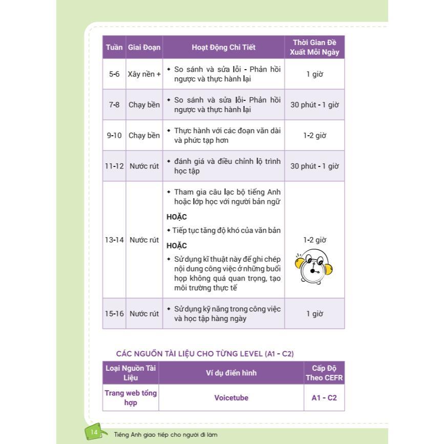 - Nội dung cuốn sách Tự Học Tiếng Anh Giao Tiếp Cho Người Đi Làm Nội dung cuốn sách được chia thành 5 phần chính, mỗi phần đều bám sát nhu cầu thực tế của người đi làm. Đồng thời, cuốn sách được xây dựng phù hợp với lịch trình bận rộn, ít thời gian để học tiếng Anh.