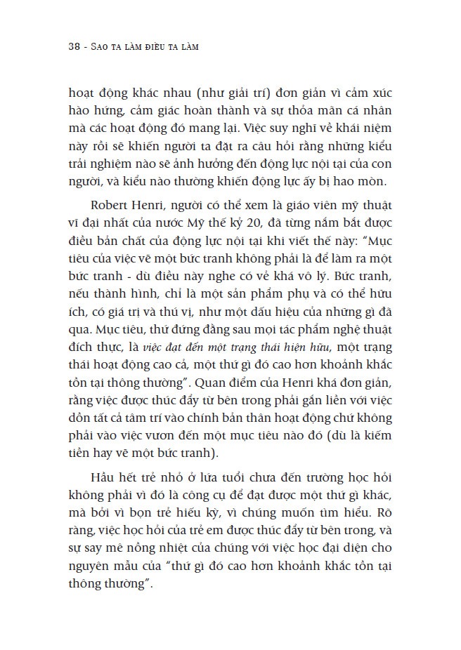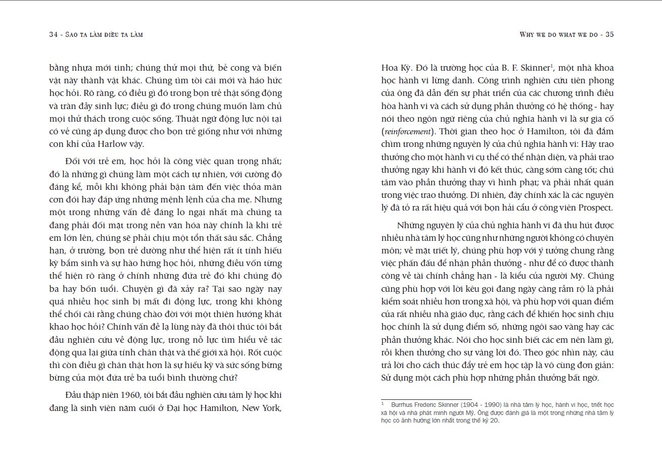 Sao Ta Làm Điều Ta Làm Thấu hiểu động lực; Giải mã hành vi; Làm chủ cuộc đời – Quyển sách chứa đựng hy vọng, cho biết những gì chúng ta có thể làm với chính mình Liệu rằng, mọi quyết định mà bạn đưa ra trong từng giai đoạn của cuộc đời có chính là từ niềm yêu thích, sự thôi thúc từ bên trong hay bị chi phối bởi các tác nhân bên ngoài? Đứng trước những ngã rẽ của cuộc đời, chúng ta luôn vật lộn để đưa ra những lựa chọn. Khó phân định đâu là quyết định xuất phát từ việc bản thân muốn “chọn làm”, đâu là những quyết định bị kiểm soát “phải làm”. Bắt nguồn từ trăn trở tương tự về việc tự chủ hay bị kiểm soát,  Edward L. Deci cùng cộng sự của mình đặt ra câu hỏi: Tại sao trẻ em chào đời với thiên hướng khát khao học hỏi, chúng tò mò và hiếu kỳ với tất cả mọi thứ, thế nhưng tính hiếu kỳ và năng lực học hỏi này dần suy giảm khi bọn trẻ bước vào môi trường học đường? Bằng những nghiên cứu và quan sát của mình, Edward L. Deci đã cho ra đời quyển sách “Sao ta làm điều ta làm”, nhằm giúp giải quyết những trăn trở về động lực thúc đẩy hành vi con người thông qua các nghiên cứu về khía cạnh nền tảng của Tâm lý học hành vi: Động lực. Edward L. Deci trình bày về động lực nội tại của con người xoay quanh sự phân biệt quan trọng trong hành vi, giữa việc nó là tự chủ hay bị kiểm soát. Tự chủ là hành động đúng theo cái tôi của bản thân, nghĩa là cảm thấy tự do và tự nguyện khi hành động. Ngược lại, bị kiểm soát nghĩa là hành động vì phải chịu áp lực. Khi bị kiểm soát, con người hành động mà không cảm thấy có sự tán thành của bản thân. Lúc này, những hành vi của họ không phải là biểu hiện của cái tôi, vì cái tôi đã bị kiểm soát và khuất phục. Một hành vi được coi là lành mạnh, hiệu quả và có khả năng tự duy trì phải đến từ một động lực nội tại có tính tự chủ, hợp nhất với cái tôi của mỗi người. Hoạt động tự chủ đòi hỏi rằng một điều lệ hay quy tắc được nội hóa phải được chấp nhận là của bản thân bạn; điều lệ đó phải trở thành một phần trong bạn. “Yếu tố then chốt để xác định liệu con người có đang sống một cách tự chủ hay không là liệu họ có cảm thấy, tận sâu bên trong, rằng những hành động của họ là lựa chọn của chính họ hay không.”, Edward L. Deci nhấn mạnh. Có nhiều hiểu lầm về những thứ có thể tạo động lực cho hành vi con người, trong đó hai hiểu lầm cơ bản nhất là phần thưởng và hình phạt. Hình phạt hiển nhiên là thứ có tính kiểm soát, và vì vậy nó làm xói mòn động lực. Nhưng trái với suy nghĩ của nhiều người, phần thưởng là động lực bên ngoài, và nó cũng làm suy yếu động lực nội tại – sức sống, sự tự nguyện, tính chân thật và hiếu kỳ vốn nằm trong bản chất của con người. Qua 13 chương sách, Edward L. Deci cùng cộng sự Richard M. Ryan, bước đầu xác định những điểm đối lập của sự tự chủ và bị kiểm soát, từ đó chỉ ra tầm quan trọng của tính tự chủ, nhu cầu tự chủ trong mỗi con người. Từ những nghiên cứu về động lực để xem xét mối quan hệ giữa sự tự chủ với trách nhiệm, khám phá sự khác biệt giữa động lực nội tại và ngoại tại, Edward L. Deci dẫn dắt độc giả một lần nữa suy ngẫm vấn đề thúc đẩy tính trách nhiệm trong cuộc sống, duy trì tính tự chủ giữa vô vàn sự kiểm soát để hướng đến cuộc sống tự do, hạnh phúc.  “Cuốn sách này chứa đầy hy vọng, vì nó cho biết những gì chúng ta có thể làm cho chính mình, cho con cái, nhân viên, bệnh nhân, học sinh và các vận động viên của chúng ta - đúng hơn là những gì chúng ta có thể làm cho xã hội”, tác giả khẳng định. “Sao ta làm điều ta làm” không phải thần dược có khả năng cứu chữa cho cuộc đời của bất cứ ai, mà với những quan sát của mình, Edward L. Deci đã đưa ra các giải pháp hữu hiệu để giải quyết các vấn đề trăn trở trong hành vi con người. Theo ông, các giải pháp này tương thích với mỗi cá nhân trong việc quản lý bản thân, và chúng có thể áp dụng cho các vai trò giáo viên, nhà quản lý, cha mẹ, bác sĩ và huấn luyện viên. Cách “chữa bệnh” bắt đầu từ việc hiểu về động lực của con người - ở mức độ có tính tự chủ và sử dụng những hiểu biết đó để quản lý bản thân hiệu quả hơn, kết nối và tạo ra những mối quan hệ bền chặt hơn, thúc đẩy sự tự chủ lành mạnh của bản thân và những người xung quanh để kiến tạo một cuộc sống ý nghĩa. Tiến sĩ Edward L. Deci sinh năm 1942, là giáo sư tâm lý học và là giám đốc chương trình động lực con người ở Đại học Rochester. Cùng với Richard Ryan, Edward L. Deci đã xây dựng Lý thuyết về tự quyết (SDT – self-determination theory). SDT là học thuyết vĩ mô về động lực con người và có sức ảnh hưởng lớn trong nhánh tâm lý học hành vi. Lý thuyết này 