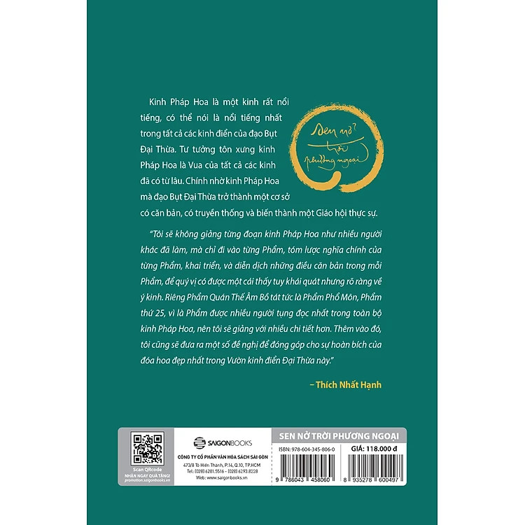 Với Sen nở trời phương ngoại, Thiền sư Thích Nhất Hạnh sẽ không giảng từng đoạn kinh Pháp Hoa như nhiều người khác đã làm, mà chỉ đi vào từng Phẩm, tóm lược nghĩa chính của từng Phẩm, khai triển, và diễn dịch những điều căn bản trong từng Phẩm, để quý vị độc giả có được một cái thấy tuy khái quát nhưng rõ ràng về ý kinh. Riêng Phẩm Quán Thế Âm Bồ tát tức là Phẩm Phổ Môn, Phẩm thứ 25, vì là Phẩm được nhiều người tụng đọc nhất trong toàn bộ kinh Pháp Hoa, nên Thiền sư sẽ giảng với nhiều chi tiết hơn. Thêm vào đó, Người cũng sẽ đưa ra một số đề nghị để đóng góp cho sự hoàn bích của đóa hoa đẹp nhất trong Vườn kinh điển Đại Thừa này.