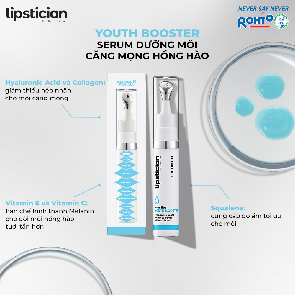 Serum Dưỡng Môi Căng Mọng Hồng Hào Lipstician Lip Serum Youth Booster (9g) Serum dưỡng môi Lipstician Lip Serum được đúc kết và chọn lọc từ kinh nghiệm hơn 130 năm chăm sóc làn môi trong nhiều thập kỷ. Công thức Essential 10 bao gồm 10 thành phần an toàn & hiệu quả, với tỷ lệ kết hợp tối ưu để chăm sóc và giải quyết các vấn đề về môi hiệu quả nhất. Thông tin sản phẩm: