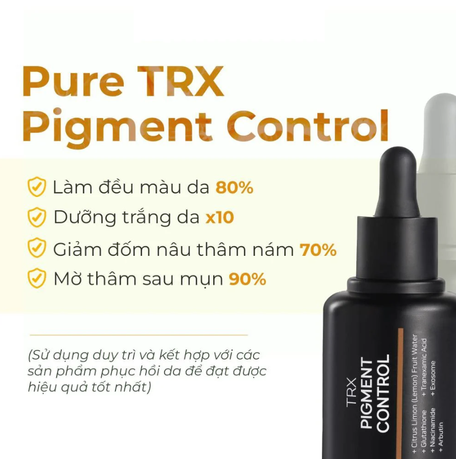 Serum giảm nám Kyung Lab Pure TRX Serum giảm nám Kyung Lab Pure TRX hỗ trợ chăm sóc da trẻ hóa toàn diện. Công thức dưỡng da vượt trội, dưỡng da thẩm thấu nhanh các hoạt chất.    Công Dụng Của Tinh Chất Kyung Lab Pure Trx Pigment Control  Sáng da, hủy nám hoàn hảo từ 4 hoạt chất vàng: Tranexamic, Glutathione, Arbutin, Niacinamide  Ngăn ngừa tích tụ sắc tố melanin, làm mờ vết nám, sạm và làm sáng da  Kích thích biến đổi melanin sắc tố tối thành sắc tố sáng,  Làm mờ vết thâm sau mụn  Làm dịu làn da kích ứng, giảm mẩn đỏ rõ rệt  Bảo vệ làn da khỏi tổn thương bởi ánh nắng, bụi mịn, nấm  Làm dịu, phục hồi làn da bị tổn thương bởi tia UVA / UVB.  Phù hợp với: da hỗn hợp  Tình trạng da: Da không đều màu da, da cải thiện tình trạng sắc tố, da thâm, mụn, tàn nhang Kiểm Nghiệm Thực Tế: Theo nghiên cứu trên 2000 người sử dụng tại Châu Á, trong đó có 120 người Việt cho kết quả:  97.1% cảm nhận da sáng lên từ 2 – 3 tone  70.5% cảm thấy các vết nám, tàn nhang, thâm mụn mờ hẳn  86.2% cảm thấy da săn chắc, đàn hồi hơn  89.5% Cảm thấy lỗ chân lông nhỏ hơn     Thành Phần Của Tinh Chất Chất Kyung Lab Pure Trx Pigment Control  Tranexamic Acid: Giúp làm mờ rõ rệt các vết đổi màu da do tiếp xúc với ánh nắng mặt trời. Đồng thời, thành phần này cũng có thể giúp: Làm mờ vết thâm sau mụn với bất kỳ màu da nào và dường như đặc biệt hiệu quả đối với tông màu da tối. Giảm mẩn đỏ rõ rệt trên da.  Glutathione: Biến đổi melanin sắc tố tối thành sắc tố sáng, giảm hiện tượng tăng sắc tố sau viêm, làm sáng da hiệu quả.  Arbutin: Giúp ức chế tyrosinase – enzyme sản sinh ra melanin trong tế bào mang lại hiệu quả làm sáng da.  Niacinamide: Tăng sinh ceramide tự thân, trẻ hóa làm sáng da, tạo hiệu ứng trắng mịn.  TRX: PURE Pigment Control – cộng sự đắc lực bên bạn trên chặng đường đi đến một làn da trắng mướt chuẩn Hàn     Hướng Dẫn Sử Dụng Tinh Chất Chất Kyung Lab Pure Trx Pigment Control  Sau bước rửa mặt/ tẩy da chết, nước hoa hồng, serum lấy 2- 3 giọt, chia đủ 5 điểm toàn mặt, dùng tay vỗ nhẹ thẩm thấu, tiếp tục với kem dưỡng Hướng dẫn bảo quản: Bảo quản nơi thoáng mát, tránh ánh nắng trực tiếp và không bảo quản trong tủ lạnh.