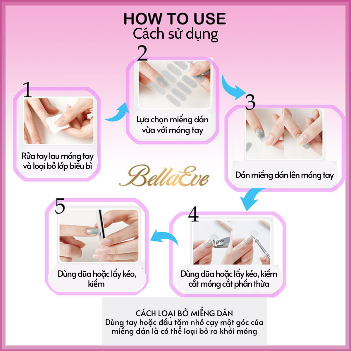 - Có thể để móng tay tự bong hoặc lấy 1 chiếc tăm nhỏ cạy 1 góc Miếng dán móng tay Bellaeve được nhiều các diễn viễn người mẫu nổi tiếng tại Hàn Quốc sử dụng. Được bán nhiều và rộng rãi trên các kênh Home Shopping tại Hàn Quốc