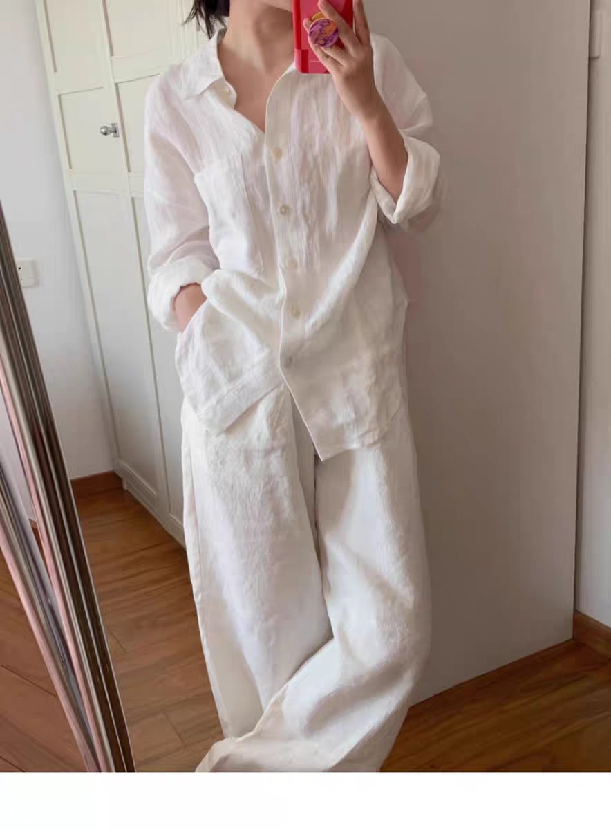 ✨Set bộ gồm áo sơ mi dài tay và quần dài ống rộng thời trang, dễ mặc, phong cách Hàn Quốc