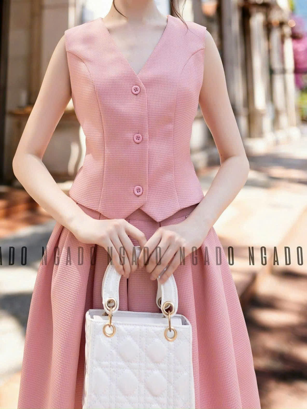 ✨Set hồng áo gile chân váy xoè xếp ly NGADO , set áo váy xoè