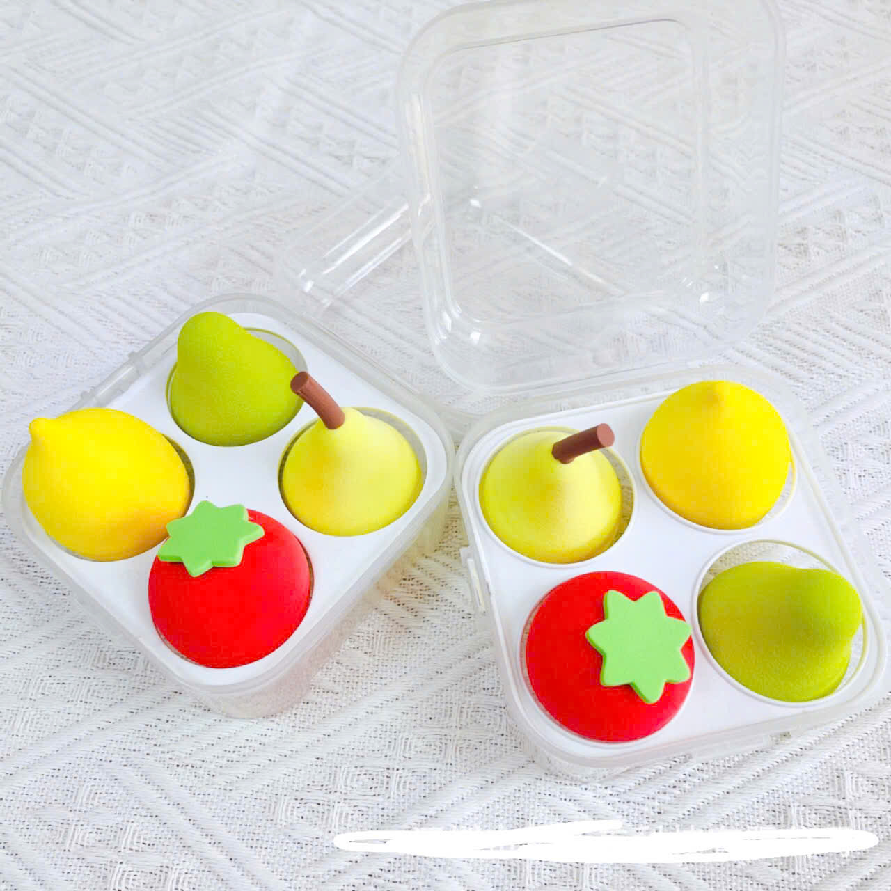 -Hộp bông tán phấn trang điểm 4 món hình trái cây xinh xắn nhiều màu , có hộp đựng siêu đáng yêu cute -Xuất xứ : Trung Quốc -Chất liệu : cao su non ưa