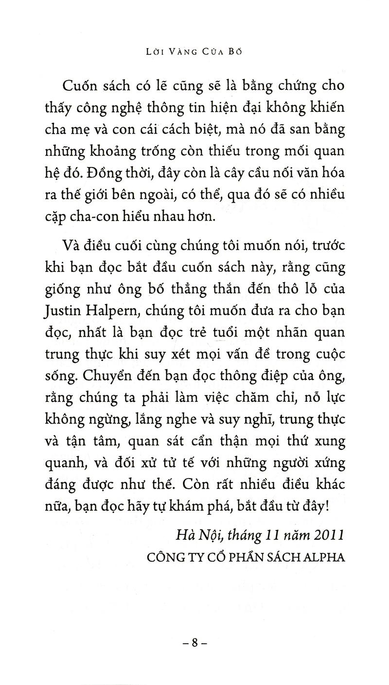Cuốn sách này có lẽ cũng sẽ là bằng chứng cho việc công nghệ thông tin hiện đại không khiến cho cha mẹ và con cái cách biệt, mà nó đã san bằng những khoảng trống còn chưa được hiểu hết về nhau trong mối quan hệ đó. Đồng thời, cuốn sách còn là cây cầu nối văn hóa ra thế giới bên ngoài, có thể, qua đó sẽ có nhiều cặp cha-con hiểu nhau hơn.
