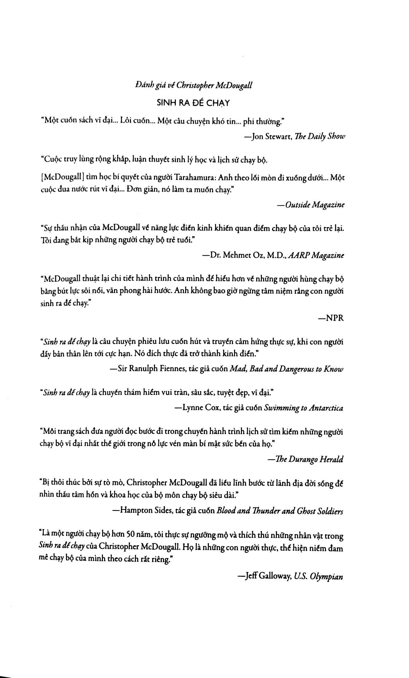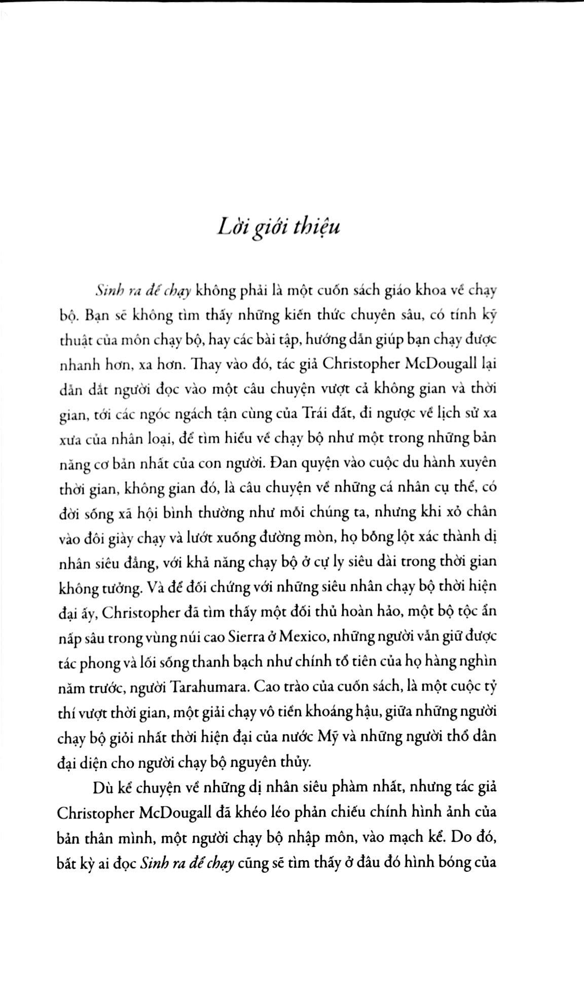 Sống ngăn cách với thế giới qua hẻm núi Copper Canyon (Mexico), người thổ dân Tarahumara đã tôi rèn khả năng chạy bộ hàng trăm dặm không ngơi nghỉ mà không gặp chấn thương nào. Nhà báo kỳ cựu đồng thời cũng là người chạy bộ hay mắc chấn thương Christopher McDougall đã lên đường tìm bí mật của họ. Dọc hành trình, anh đưa người đọc từ phòng thí nghiệm ở Đại học Harvard xuống thung lũng nóng như nung, lên những đỉnh cao buốt giá xuyên miền Bắc Mỹ, quê hương của người chạy bộ siêu phàm đẩy cơ thể đến cực hạn và cuối cùng là cuộc so tài thế kỷ trong hẻm núi Copper Canyon giữa những vận động viên chạy bộ cự phách nhất nước Mỹ và tộc người chạy bộ. Câu chuyện khó tin của McDougall không chỉ cuốn hút trí não mà còn tiếp sinh lực cho cơ thể khi bạn nhận ra từ thẳm sâu bên trong, m.ình được SINH RA ĐỂ CHẠY.