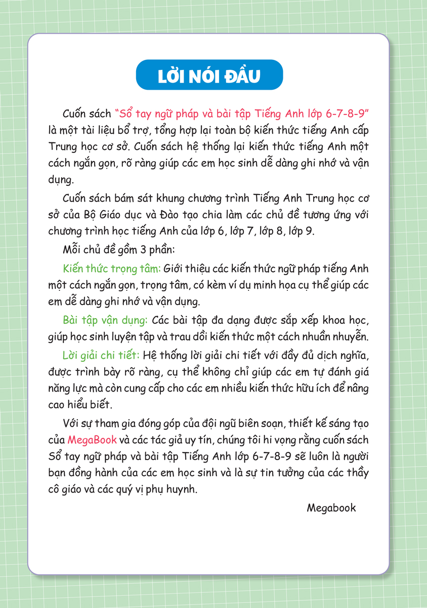 - Lời giải chi tiết, dễ hiểu Hệ thống lời giải chi tiết với đầy đủ dịch nghĩa, được trình bày rõ ràng, cụ thể, không chỉ giúp các em tự đánh giá năng lực mà còn cung cấp cho các em nhiều kiến thức hữu ích để nâng cao hiểu biết. Chúng tôi hi vọng rằng cuốn sách Sổ Tay Ngữ Pháp Và Bài Tập Tiếng Anh Lớp 6-7-8-9 sẽ luôn là người bạn đồng hành của các em học sinh và là sự tin tưởng của các thầy cô giáo và các quý vị phụ huynh!