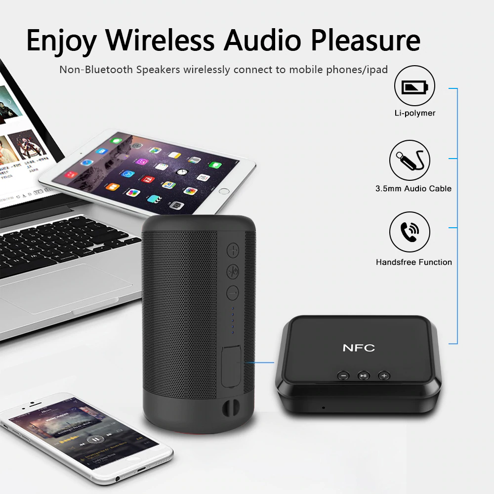 Thiết bị thu phát âm thanh Bluetooth đa năng NFC M6 Thông số kỹ thuật: - Bluetooth: Bluetooth 5.0 - Chip: AC6951C - Pin: Lithium-ion 3.7V/500mAh - Thời gian sử dụng: Nghe nhạc khoảng 10
