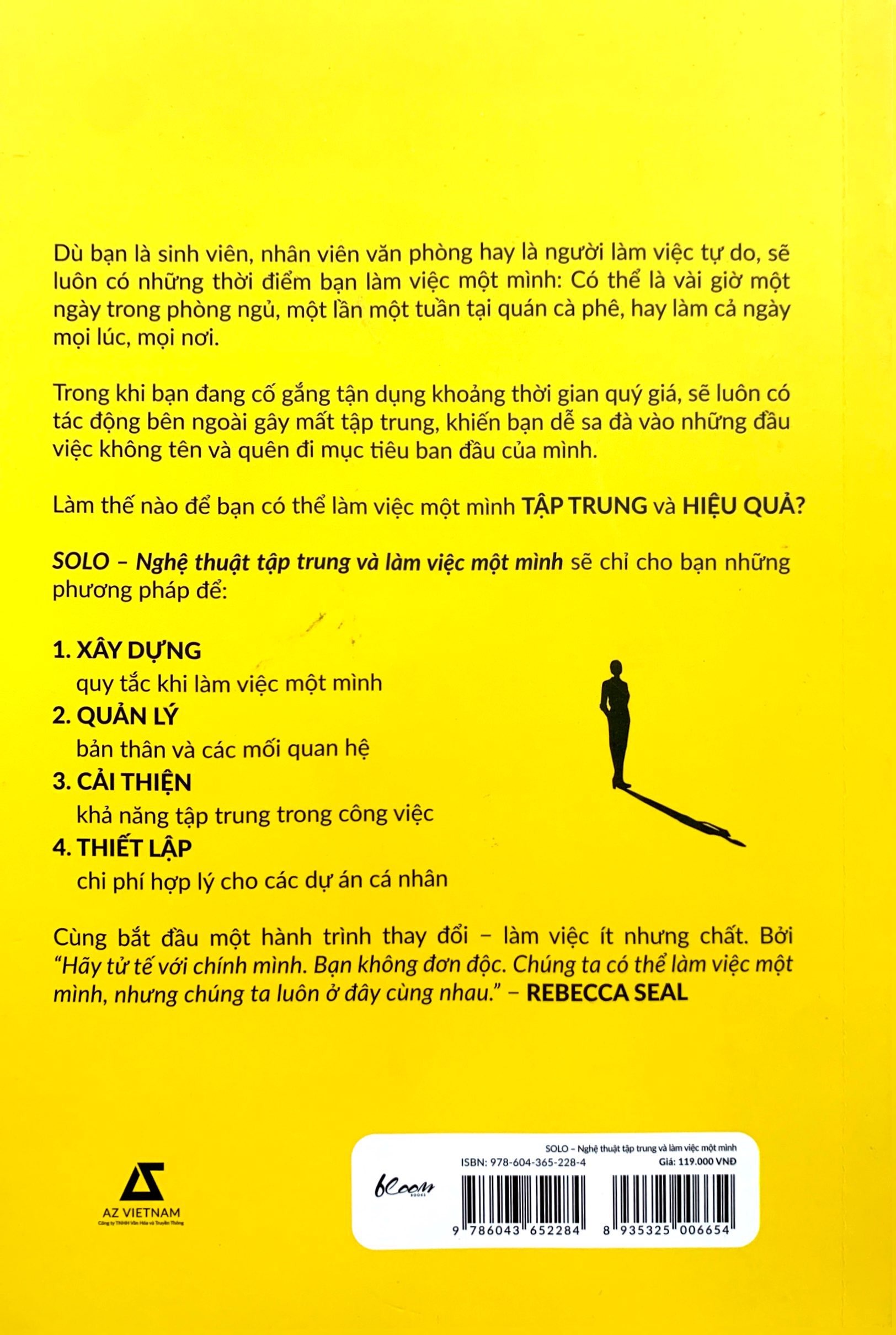 - THIẾT LẬP chi phí hợp lý cho các dự án cá nhân Mong rằng, cuốn sách này sẽ giúp bạn xây dựng một tư duy mới mẻ về làm việc một mình và tự do, cũng như một tinh thần bền bỉ để làm việc hiệu quả và thành công trong cuộc sống. Hãy cùng SOLO – Nghệ thuật TẬP TRUNG và làm việc MỘT MÌNH bắt đầu một hành trình thay đổi - làm việc ít nhưng chất, bởi: “Hãy tử tế với chính mình. Bạn không đơn độc. Chúng ta có thể làm việc một mình, nhưng chúng ta luôn ở đây cùng nhau.”