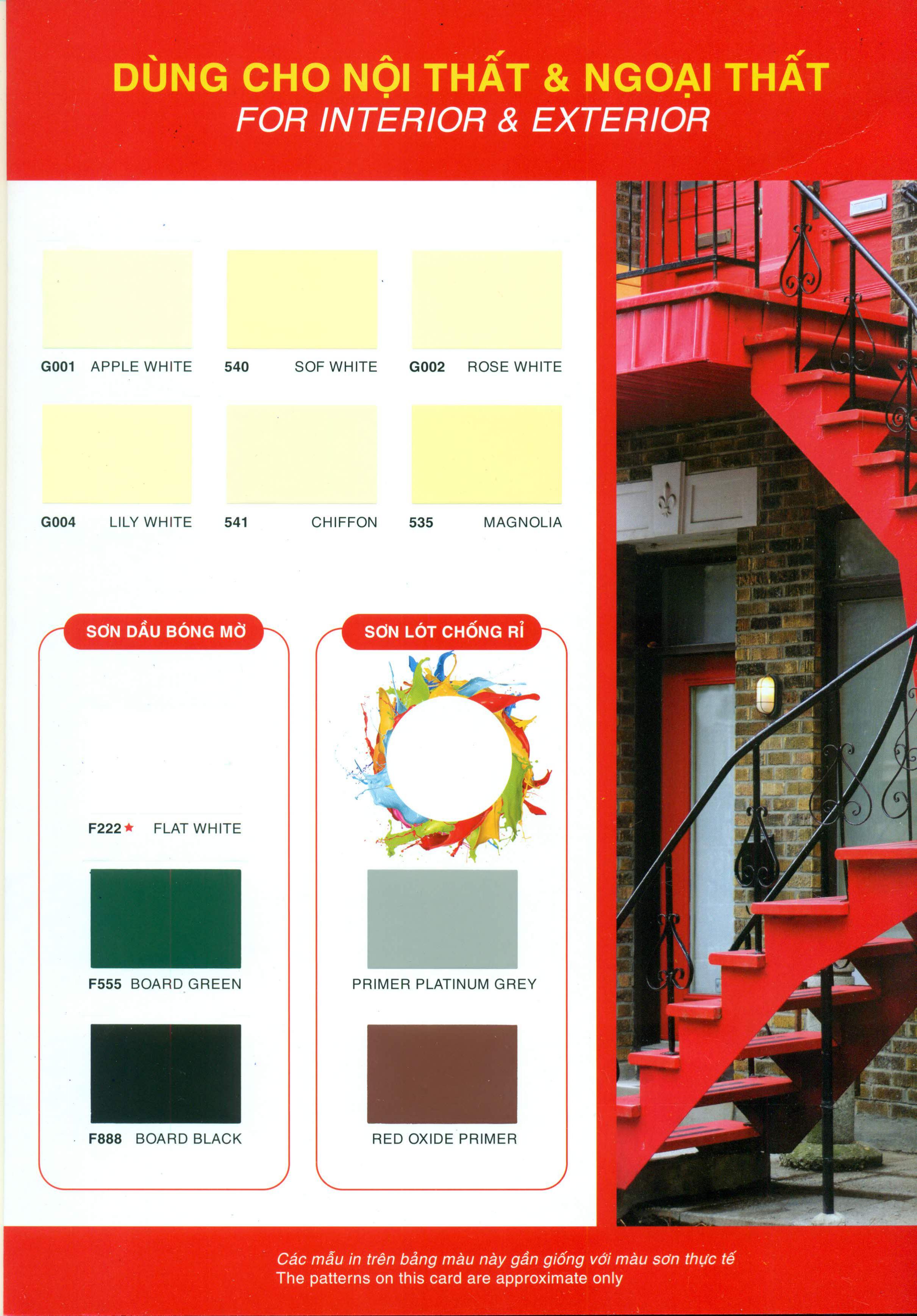 Mã màu sơn dầu Galant: 433 Ivory; 534 Jonquil; 512 Crange; 543 Silver Mist; 513 Dark Cream; 505 Red; 555 Pebble; 520 Lemon Yellow; 524 Cherry Red; 580 New Brown; 509 Yellow; 514 Light Brown; 570 Antique; 522 Oxide Yellow; 519 Burn Brown; 504 Brown; 533 Tangerine; 542 Sea Mist; G006 Sky White; 502 Sky Blue; 518 Jade; 560 Pastel Grey; 526 Surf Green; 536 Ice Blue; 532 Pacific Blue; 506 Green; 5205 Platinum; 516 Eau-De-Nl; 537 Crystal Blue; 577 River Blue; 508 Emeraid Garden; 531 Stone Grey; 530 Tropicana; 529 Zircon Blue; 507 Deep Blue; 527 Dawn Grey; 503 Grey; 501 Apple Green; 528 Pacific Ocean; 410 Light Blue; 510 Black; 515 Light Green; 517 Ocean Blue; 440 Peartwinkle; 550 Aluminium; G001 Apple