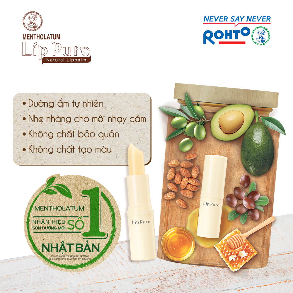 Son dưỡng không màu thành phần tự nhiên Lip Pure 3.9g Son dưỡng môi không màu thành phần tự nhiên Lip Pure là dòng son dưỡng đến từ thương hiệu Mentholatum với 100% thành phần tự nhiên và thành phần dùng trong thực phẩm, không chất bảo quản, không chất tạo màu, an toàn cho cả những làn môi nhạy cảm nhất. Mentholatum chính thức được trao quyền thương hiệu cho Rohto Nhật Bản từ năm 1975. Kể từ đó, biểu tượng Little Nurse (Cô y tá nhỏ) được người tiêu dùng chào đón và trở thành niềm tự hào của các sản phẩm mang thương hiệu Mentholatum. Cho đến nay, thương hiệu Mentholatum vẫn giữ nguyên vị trí son dưỡng môi số 1 Nhật Bản qua từng năm. Đó là sự bảo chứng cho uy tín và chất lượng của sản phẩm son dưỡng môi đến từ Rohto. Thông tin sản phẩm: