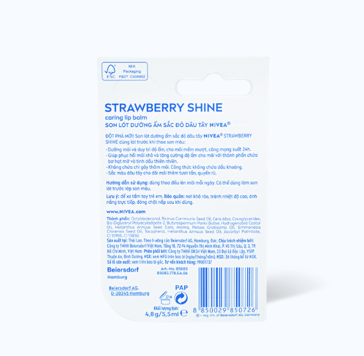 Thành phần Ricinus Communis Seed Oil, Polyisobutene, Octyldodecanol, Pentaerythrityl Tetraisostearate, Hydrogenated Polydecene, Candelilla Cera, Butyrospermum Parkii Butter, Cera M Công dụng Son dưỡng ẩm dùng cho môi. Giúp dưỡng môi và trang điểm cho khuôn mặt. Cách sử dụng Thoa trực tiếp lên môi, điều chỉnh lượng son môi phù hợp với nhu cầu và sắc thái môi. Thích hợp với bốn mùa trong năm. Bảo quản: Nơi khô ráo, thoáng mát và tránh nhiệt độ cao. Trọng lượng: 4.8g Xuất xứ thương hiệu: Đức Thương hiệu: Nivea Sản xuất tại: Beiersdorf (Thái Lan)