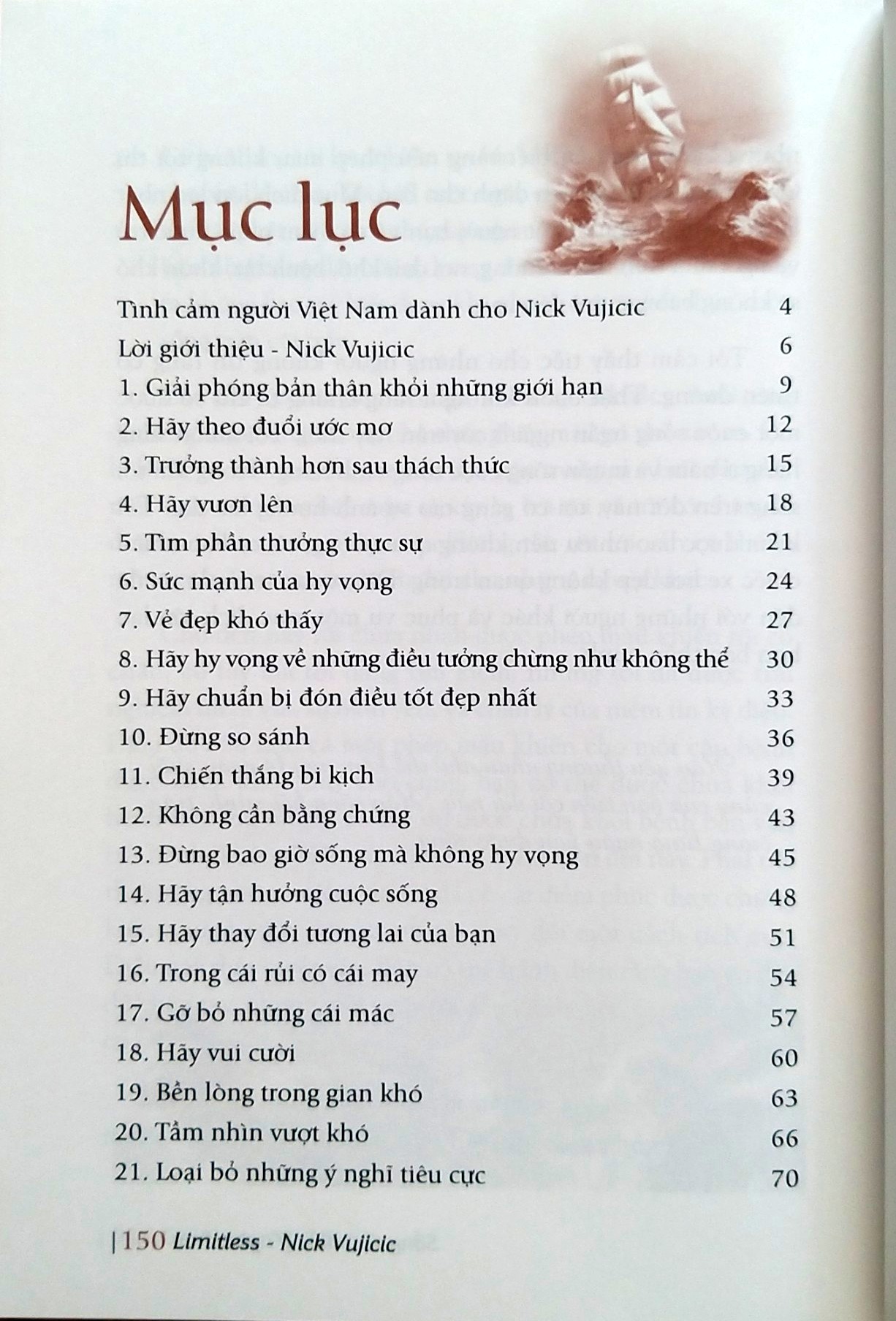 Sinh ra không có một cơ thể lành lặn, Nick chào đời trong tình trạng không tay không chân. Từng có ý định tự tử, tuyệt vọng đến mức tin rằng cuộc sống của mình sẽ chẳng có giá trị gì hết và anh sẽ mãi mãi là gánh nặng cho những người mà anh yêu thương. Nhưng qua thời gian, Nick đã tự nhận thức được về ý nghĩa đặc biệt của sự khuyết thiếu tay chân khi anh được sinh ra, đó là sứ mạng trở thành người truyền cảm hứng và khích lệ tinh thần tất cả những người khác trên trái đất này. Nick nhận ra: “Cuộc sống không có giới hạn nào ngoài những giới hạn ta tự đặt ra cho chính bản thân mình”. CHÌA KHÓA MỞ CỬA TÂM HỒN trong cuốn sách lần này, khi đã nhận diện được bản thân và vượt qua giới hạn mà bản thân mình đặt ra, Nick đề cao sức mạnh của sự hy vọng. Hy vọng giống như một phương thuốc tinh thần hữu hiệu, không chỉ xoa lành những buồn đau, tuyệt vọng mà còn hướng con người tới những điều tốt đẹp trong tương lai. Nick cho rằng “Mất hy vọng còn tồi tệ hơn mất chân tay” và khuyên bạn “Hãy hy vọng về những điều tưởng chừng như không thể”. Bởi vì “Hy vọng là nơi những ước mơ bắt đầu.