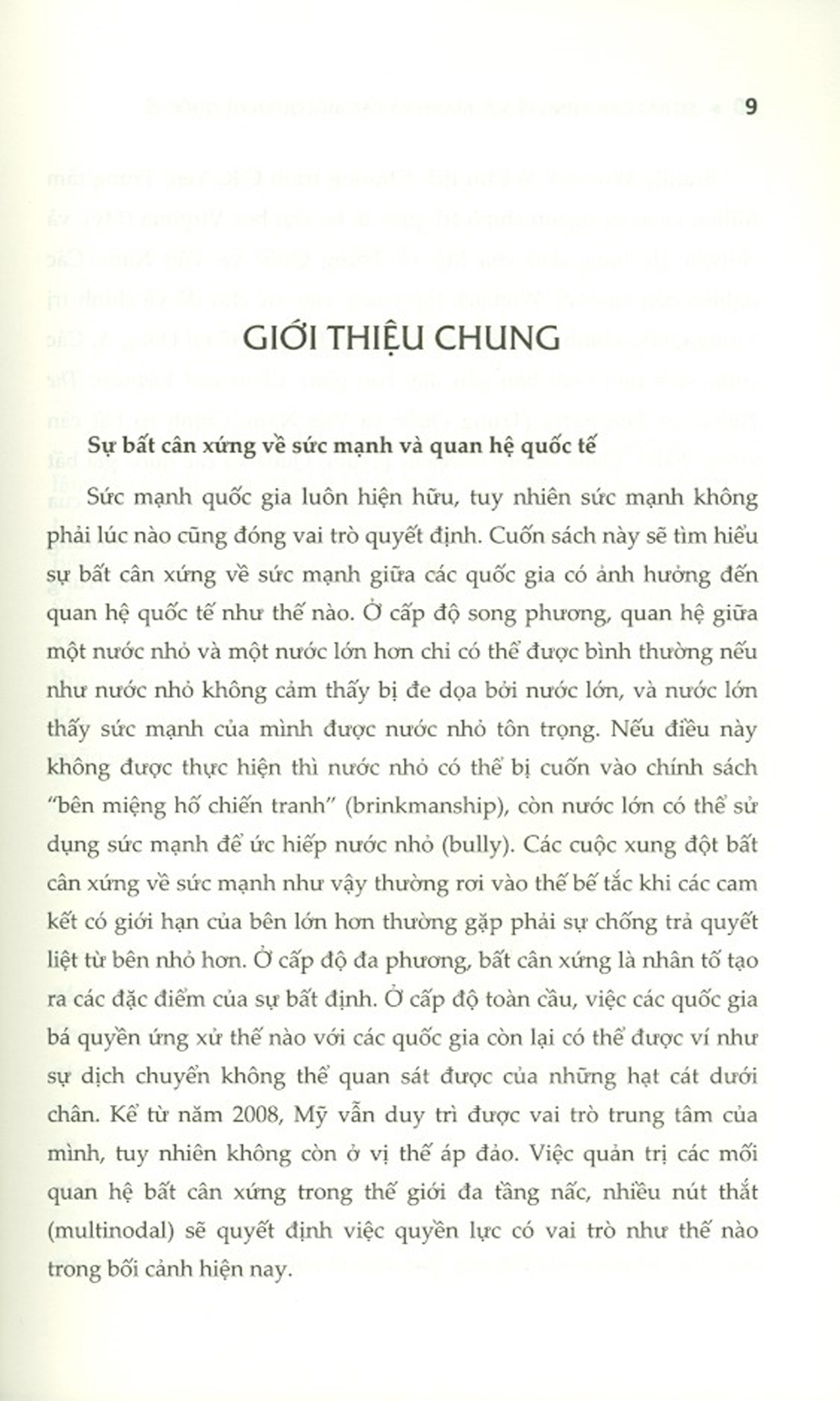 Cuốn sách chứa đựng những tìm tòi, nghiên cứu mới mẻ, thú vị và công phu của tác giả về sự bất cân xứng trong sức mạnh và các mối quan hệ quốc tế, tác động của nó đến hệ thống chính trị và cán cân quyền lực trên thế giới.