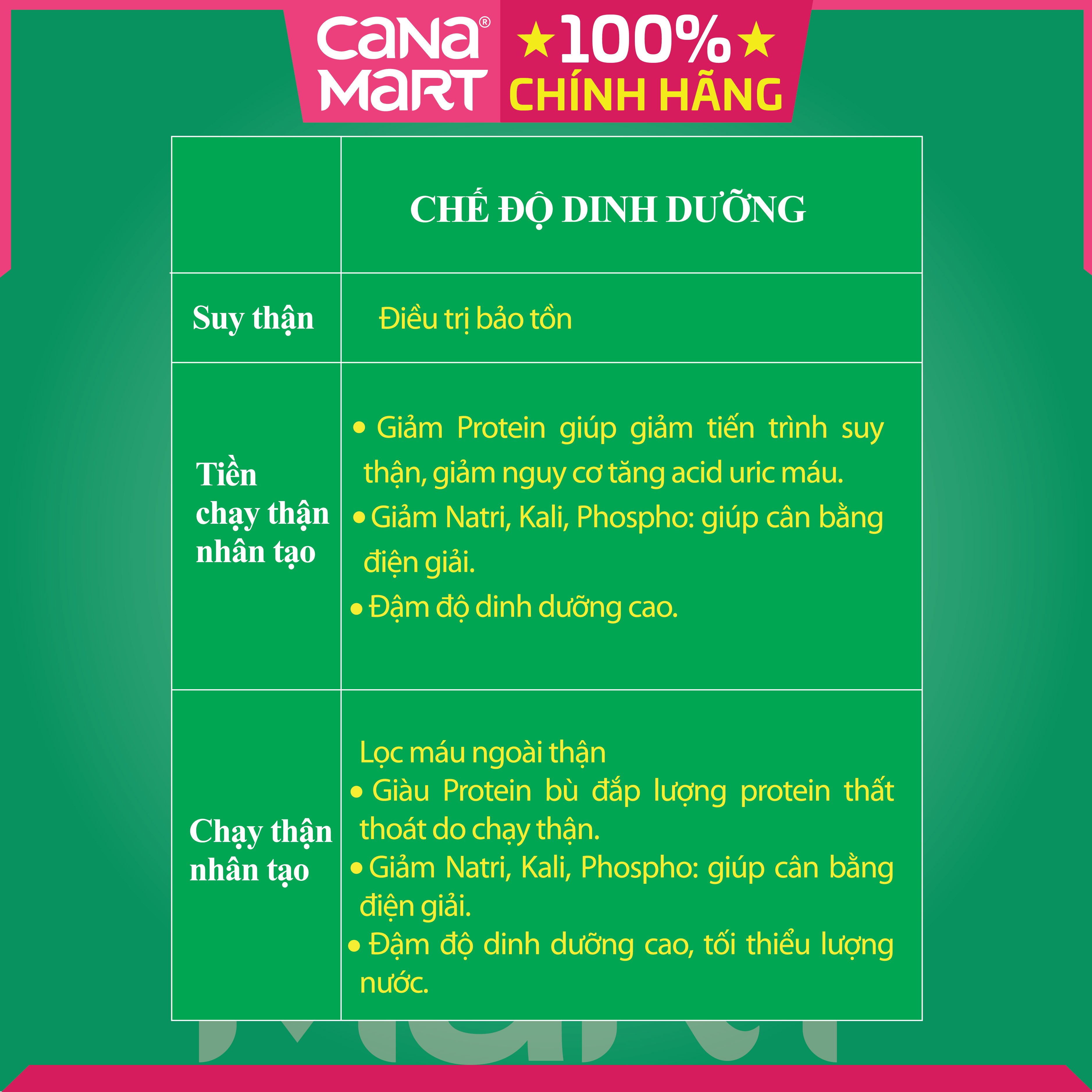 GIẢM PROTEIN & GIÚP CÂN BẰNG ĐIỆN GIẢIProtein thấpgiúp giảm Urê máu, giảm tải cho hoạt động của thận.Ít Natri - Kali - Phốtpho giúp cân bằng điện giải, giảm tải hoạt động cho thận, giảm tình t...