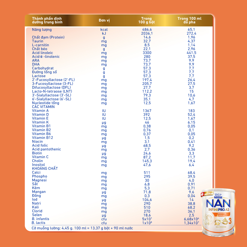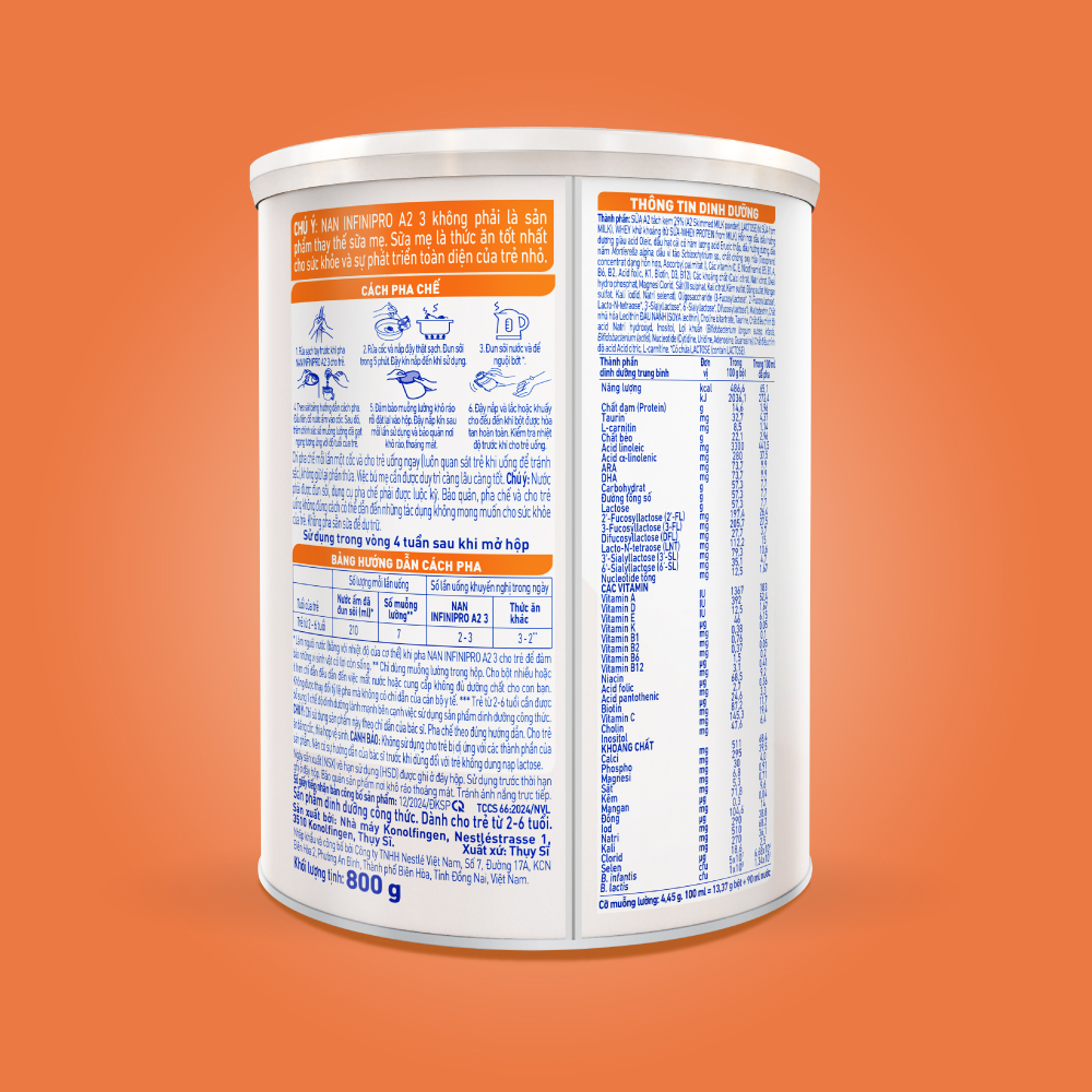 Tên sản phẩm: Sản phẩm dinh dưỡng công thức Nestlé NAN INFINIPRO A2 3 800g Xuất xứ: Thụy Sĩ Khối lượng tịnh: 800g/lon Độ tuổi phù hợp: 2 - 6 tuổi Thành phần: SỮA A2 tách kem 29% (A2 Skimmed MILK powder), LACTOSE (từ SỮA-from MILK), WHEY khử khoáng (từ SỮA-WHEY PROTEIN from MILK), Hỗn hợp dầu (dầu hướng dương giàu acid Oleic, dầu hạt cải có hàm lượng acid Erucic thấp, dầu hướng dương, dầu nấm Mortierella alpina, dầu vi tảo Schizochytrium sp., chất chống oxy hóa (Tocopherol concentrat dạng hỗn hợp, Ascorbyl palmitat)), Các vitamin (C, E, Nicotinamid, B5, B1, A, B6, B2, Acid folic, K1, Biotin, D3, B12), Các khoáng chất (Calci citrat, Natri citrat, Dikali hydro phosphat, Magnesi Clorid, Sắt (II) sulphat, Kali citrat, Kẽm sulfat, Đồng sulfat, Mangan sulfat, Kali iodid, Natri selenat), Oligosaccharide (3-Fucosyllactose, 2'-Fucosyllactose, Lacto-N-tetraose, 3'-Sialyllactose, 6'-Sialyllactose, Difucosyllactose), Maltodextrin, Chất nhũ hóa Lecithin ĐẬU NÀNH (SOYA lecithin), Choline bitartrate, Taurine, Chất điều chỉnh độ acid Natri hydroxyd, Inositol, Lợi khuẩn (Bifidobacterium longum subsp. infantis, Bifidobacterium lactis), Nucleotide (Cytidine, Uridine, Adenosine, Guanosine), Chất điều chỉnh độ acid Acid citric, L-carnitine. () có chứa LACTOSE (contain LACTOSE) Cảnh báo: Không sử dụng cho trẻ bị dị ứng với các thành phần của sản phẩm. Nên có sự hướng dẫn của bác sĩ trước khi dùng đối với trẻ không dung nạp đường lactose. Cách pha chế: