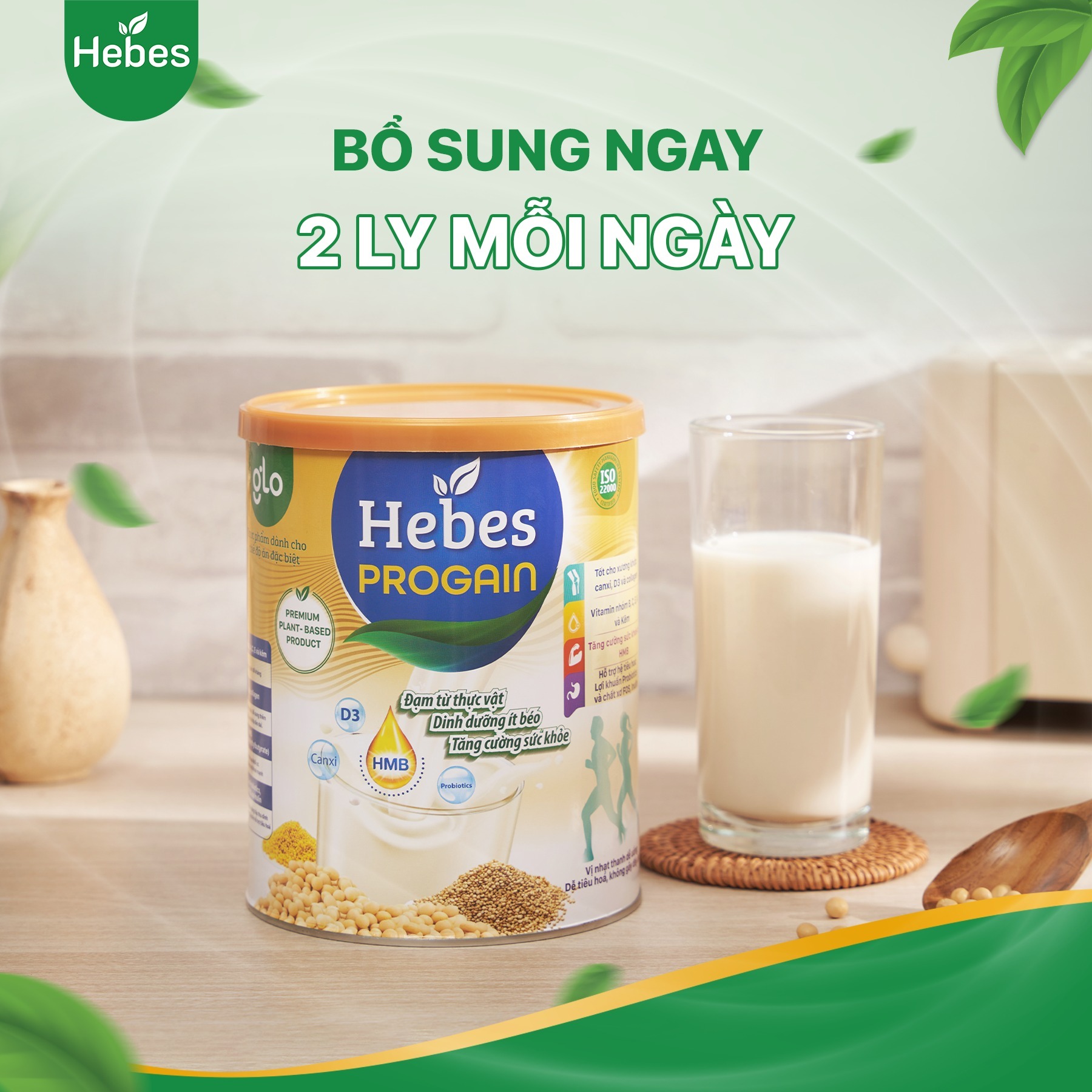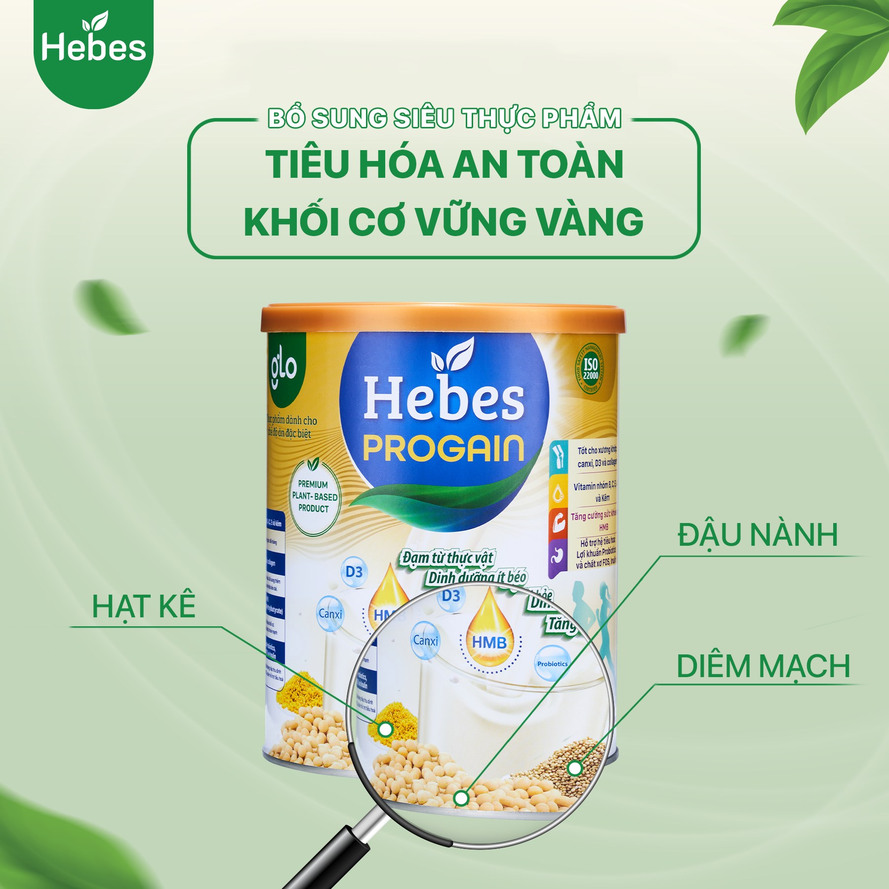HEBES PROGAIN VỚI CÔNG THỨC ĐỘC QUYỀN 100% TỪ THỰC VẬT VÀ BỔ SUNG HMB GIÚP PHỤC HỒI VÀ GIẢM THIỂU TÌNH TRẠNG NHỨC MỎI CƠ Giới thiệu BỔ SUNG NĂNG LƯỢNG, PHỤC HỒI CƠ VÀ THỂ CHẤT CHO NGƯỜI LỚN TUỔI, NGƯỜI ỐM YẾU CẦN PHỤC HỒI THỂ LỰC Chỉ 2 ly HEBES PROGAIN mỗi ngày, tăng cường khối cơ lành mạnh với công thức kết hợp đạm thực vật cùng dưỡng chất vàng HMB (2,1g/45g bột), dưỡng chất vàng giúp cải thiện scws mạnh và chức năng cơ ở người cao tuổi.