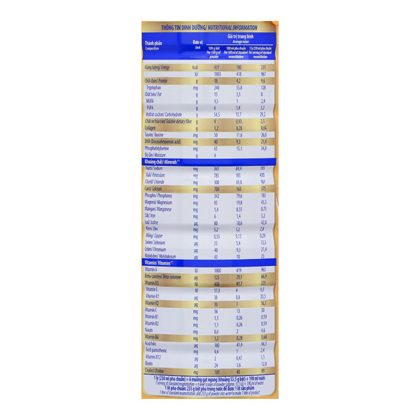 - Hỗ trợ trí nhớ: Dưỡng chất SPS (Soy Phosphatidylserine) & Cholin đóng vai trò quan trọng trong việc hỗ trợ trí nhớ, giúp giảm nguy cơ suy giảm nhạn thức và sa sút trí tuệ ở người cao tuổi. Thành phần Maltodextrin, dầu thực vật, đạm đậu nành, đường, natri caseinat, các khoáng chất (kali citrat, tricalci phosphat, calci carbonat, natri clorid, dikali phosphat, magnesi phosphat, magnesi oxyd, sắt pyrophosphat, kẽm oxyd, mangan sulfat, đồng sulfat, crôm clorid, natri molybdat, kali iodid, natri selenit), chất xơ hòa tan oligofructose (FOS), đạm whey cô đặc, collagen thủy phân, xirô glucoza, sterol esters thực vật (1,3%), hương liệu tổng hợp dùng cho thực phẩm, cholin clorid, chất nhũ hóa (322(i), 471), các vitamin (natri ascorbat, E, niacin, calci D-pantothenat, hỗn hợp tocopherol, B6, ascorbyl palmitat, B1, B2, A, acid folic, beta-caroten, K1, K2, biotin, D3, B12, acid ascorbic), bột chiết xuất mầm bông cải xanh, phosphatidylserin đậu nành, taurin, DHA từ dầu cá. Có chứa sữa đậu nành và dầu cá. Đối tượng sử dụng