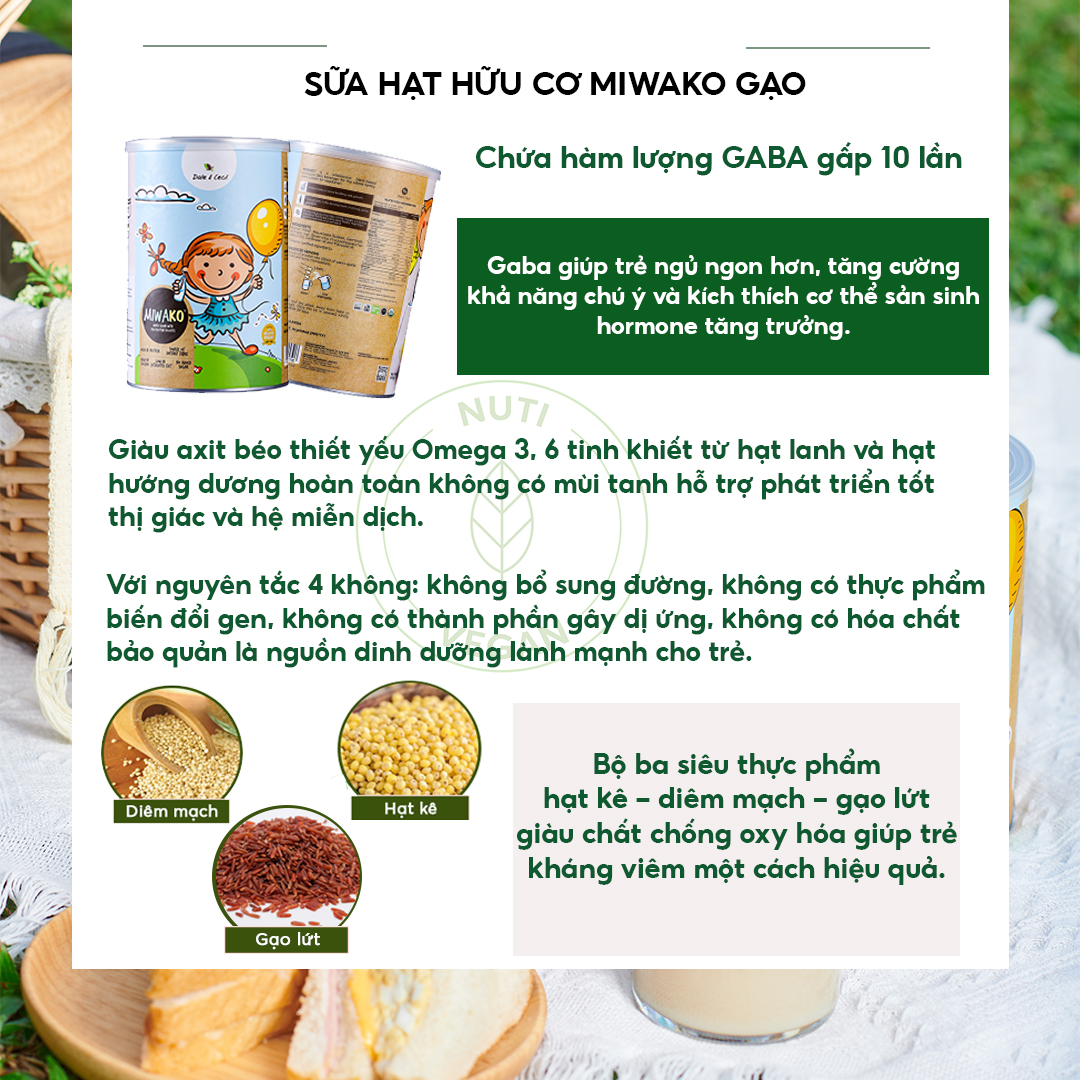 - Miwako là dòng sữa hạt hữu cơ dành cho các bé phát triển trí não & chiều cao THÔNG TIN SẢN PHẨM SỮA HẠT HỮU CƠ MIWAKO VỊ GẠO: