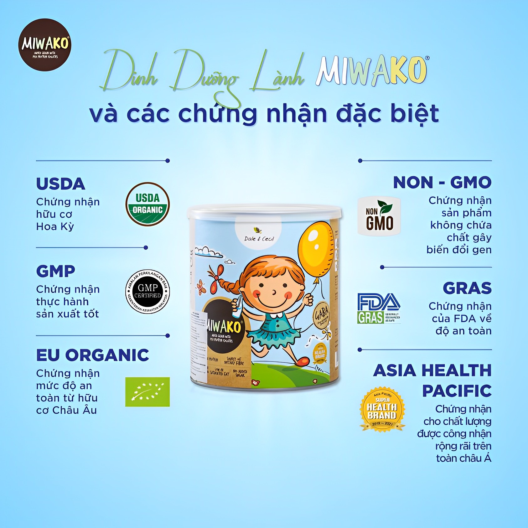- NON-GMO (Non – Genetically Modified Organism) – Không biến đổi gen. Sản phẩm đạt tiêu chuẩn Non – GMO nghĩa là sản phẩm đó được sản xuất từ 100 % nguyên liệu tự nhiên, tinh khiết, không chứa thành phần biến đổi gen và đảm bảo an toàn cho sức khỏe người sử dụng. Hiện tại Miwako đang có 3 dòng sữa chính: