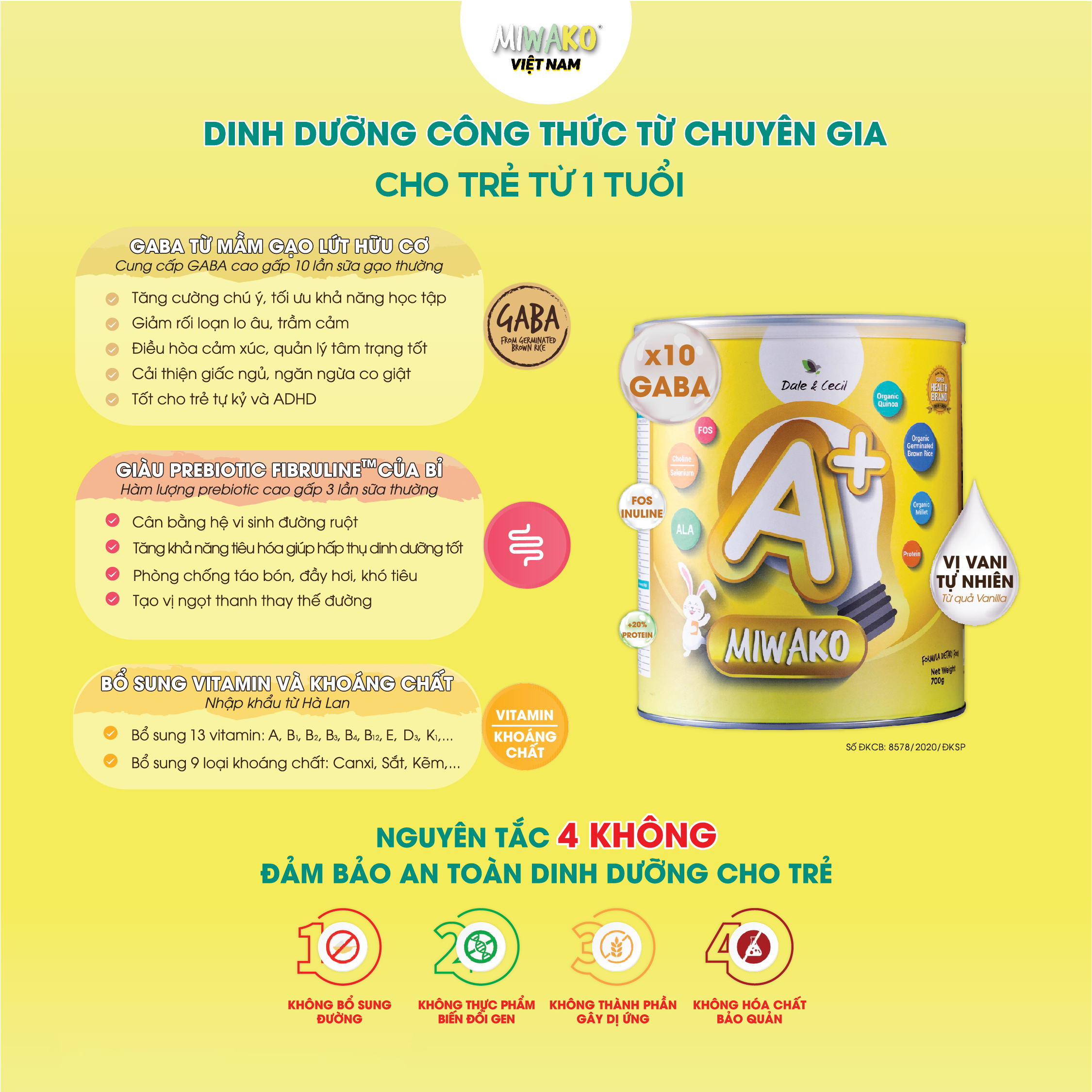 - Miwako A+ vị vani nhiều dinh dưỡng hơn dành cho các bé tăng động giảm chú ý