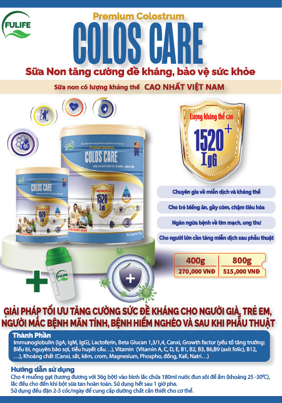 Sữa Non Colos Care giúp tăng cường sức đề kháng, hệ miễn dịch và bảo vệ sức khỏe toàn diện. Có lượng kháng thể cao nhất Việt Nam với nguồn nguyên liệu từ Mỹ, đảm bảo hàm lượng sữa non cao và chất lượng nhất. Bổ sung sữa non COLOS CARE tương đương với khoảng 300mg kháng thể IgG có trong 16g pha chuẩn, sẽ hỗ trợ tăng cường sức đề kháng giúp chống lại sự xâm nhập của các nhân tố gây hại đối với cơ thể và xây dựng một hệ miễn dịch khỏe mạnh, giúp tránh khỏi một số căn bệnh nghiêm trọng như ung thư hoặc các bệnh liên quan đến tim mạch. Công dụng nổi bật của sữa non Colos Care Ngăn ngừa bệnh về tim mạch, ung thư Cho người lớn cần tăng miễn dịch sau khi phẫu thuật Giải pháp tối ưu tăng cường sức đề kháng cho người già, trẻ em, người mắc bệnh mãn tính, hiểm nghèo sau khi phẫu thuật. Cung cấp hàm lượng vitamin, khoáng chất, canxi cùng nhiều hoạt chất thiết yếu cho cơ thể giúp hỗ trợ các cơ quan chức năng bên trong hoạt động hiệu quả và phát triển một cách tốt nhất. Giúp tăng hệ miễn dịch và kháng thể, nâng cao sức khỏe người dùng một cách toàn diện Cải thiện khả năng hấp thụ dưỡng chất, hỗ trợ quá trình chuyển hóa và trao đổi chất tốt hơn, giúp người dùng khỏe mạnh hơn mỗi ngày. Bổ sung nguồn năng lượng dồi dào, giúp người dùng thoải mái hoạt động, làm việc và học tập tốt hơn.   Các thành phần Sữa non Colos Care Immunoglobulin (IgA, IgM, IgG), Lactoferin, Beta Glucan 1,3/1,4, Canxi, Growth factor (yếu tố tăng trưởng: Biểu bì, nguyên bào sợi, tiểu huyết cầu…), Vitamin (Vitamin A, C, D, E, B1, B2, B3, B6,B9 (axit folic), B12, …) Khoáng chất (Canxi, sắt, kẽm, crom, Magnesium, Phospho, đồng, Kali, Natri…)   Tác dụng của thành phần: IgG: Hàm lượng kháng thể tự nhiên cao IgG 1520+ giúp tăng cường sức đề kháng và tăng hệ miễn dịch cho cơ thể. Kẽm, Lysine, Vitamin B: Dùng cho trẻ em đang bị biếng ăn, gầy còm, làm tăng khả năng hấp thu thức ăn, tăng cường hệ tiêu hóa giúp trẻ ăn ngon và tăng cân. Beta glucan: Ngăn chặn xơ vữa động mạch, giảm nguy cơ các bệnh về tim mạch và ung thư. Lactoferrin: Cải thiện sức khỏe sau phẩu thuật, nâng cao sức đề kháng, chống lão hóa, ngăn ngừa loãng xương.   Hướng dẫn sử dụng sữa non tăng đề kháng Cho 4 muỗng gạt (tương đương với 36g bột) vào bình lắc chứa 180ml nước đun sôi để ấm (khoảng 20-30 độ C), lắc đều cho đến khi bột sữa tan hoàn toàn. Sử dụng đều đặn 2-3 cốc/ngày để cung cấp dưỡng chất cần thiết cho cơ thể. Chú ý: Hỗn hợp sau khi đã pha nên sử dụng hết sau 1 giờ Hạn sử dụng: 24 tháng, xem trên bao bì