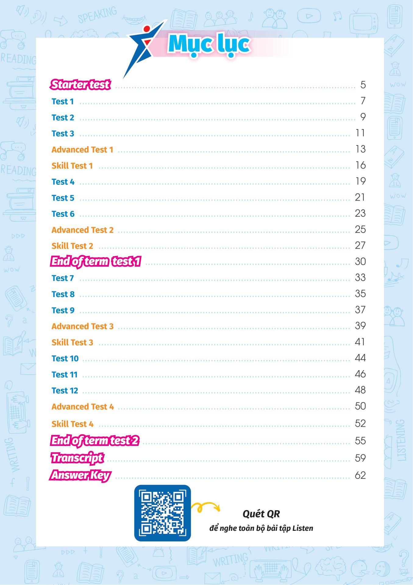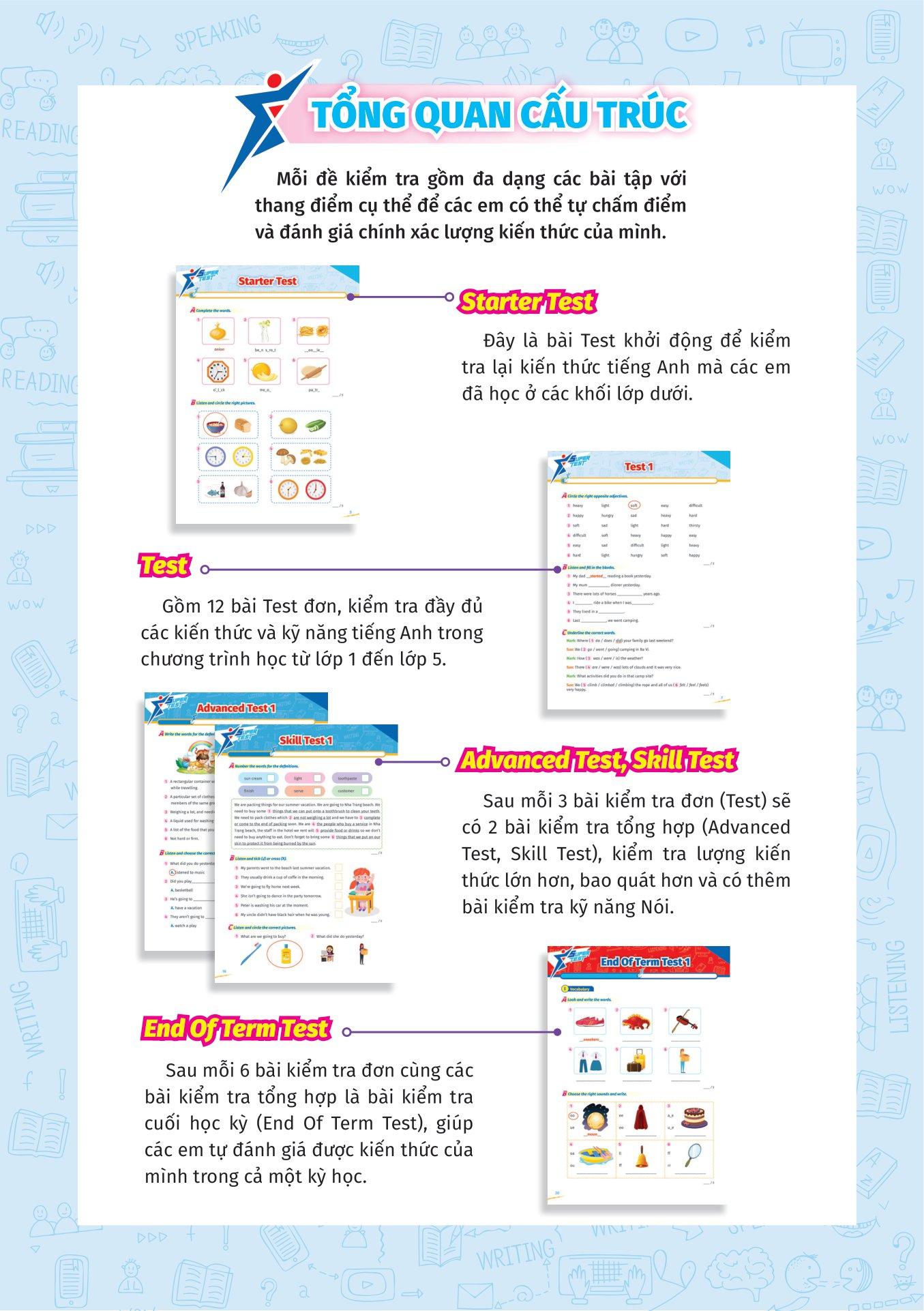 Bộ sách cung cấp các bài kiểm tra từ cơ bản đến nâng cao, bao gồm nhiều loại bài kiểm tra khác nhau, bao gồm kiểm tra từ vựng, kỹ năng nghe, đọc, viết và nói. Điều này giúp học sinh phát triển toàn diện các kỹ năng Tiếng Anh của họ và kiểm tra tất cả các khía cạnh của môn học.