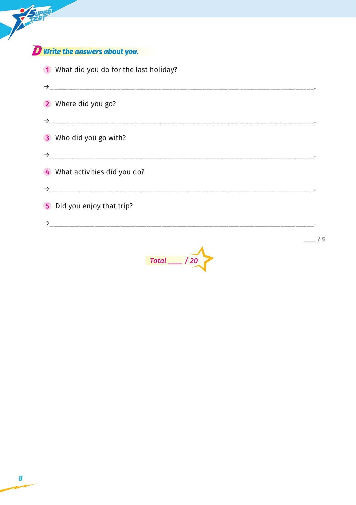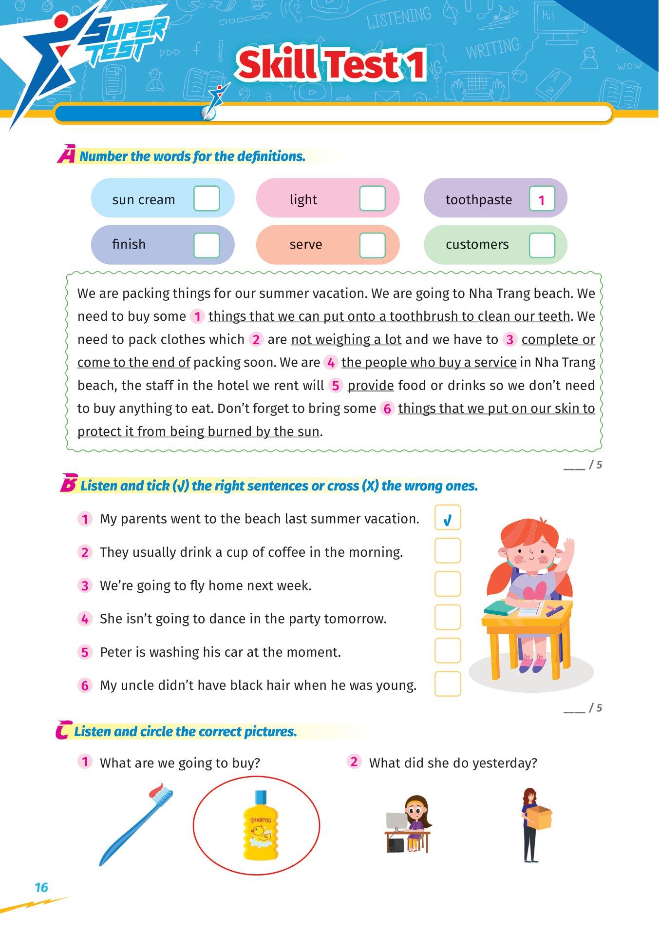 Với Bộ sách Super Test – Đề kiểm tra nhanh Tiếng Anh cho học sinh, bố mẹ sẽ giúp con tiến bộ từng ngày, tự tin với khả năng ngôn ngữ của m.ình khi ôn luyện Tiếng Anh bởi các bài tập về 4 kỹ năng: Nghe – Nói – Đọc – Viết được liên kết với nhau theo logic của bài học.