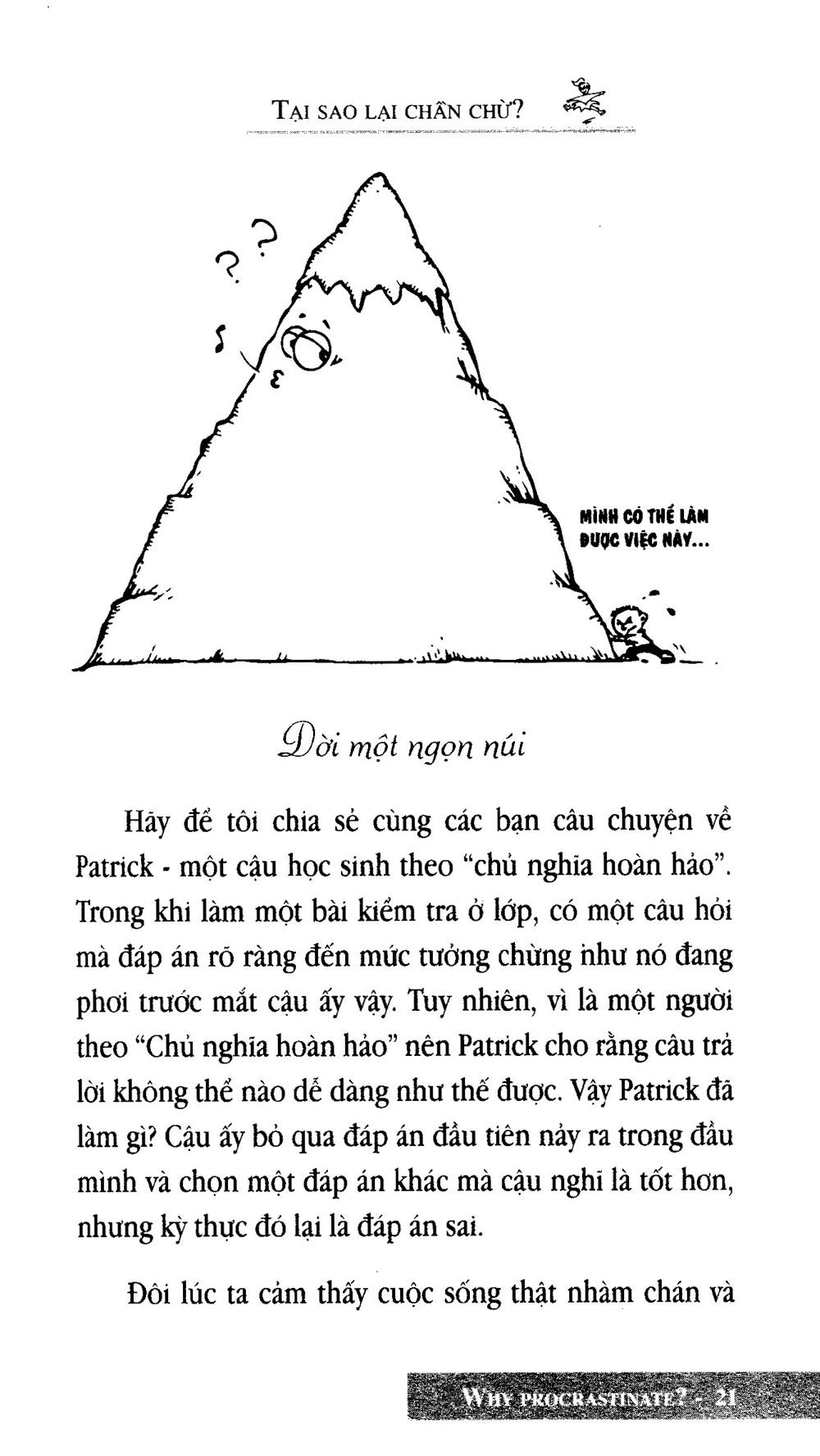 Dễ nhận thấy “Chần chừ” là sát thủ số một của thành công. “Tại sao lại chần chừ?” không chỉ là cuốn sách thực tế và hấp dẫn, mà còn là một công cụ hoàn hảo có thể giúp các bạn trẻ loại bỏ thói quen trì hoãn của mình. Với văn phong nhẹ nhàng và nhiều hình ảnh minh họa hóm hỉnh của chính tác giả, cuốn sách sẽ giúp bạn khám phá ra những lý do khiến bạn mắc bệnh này.