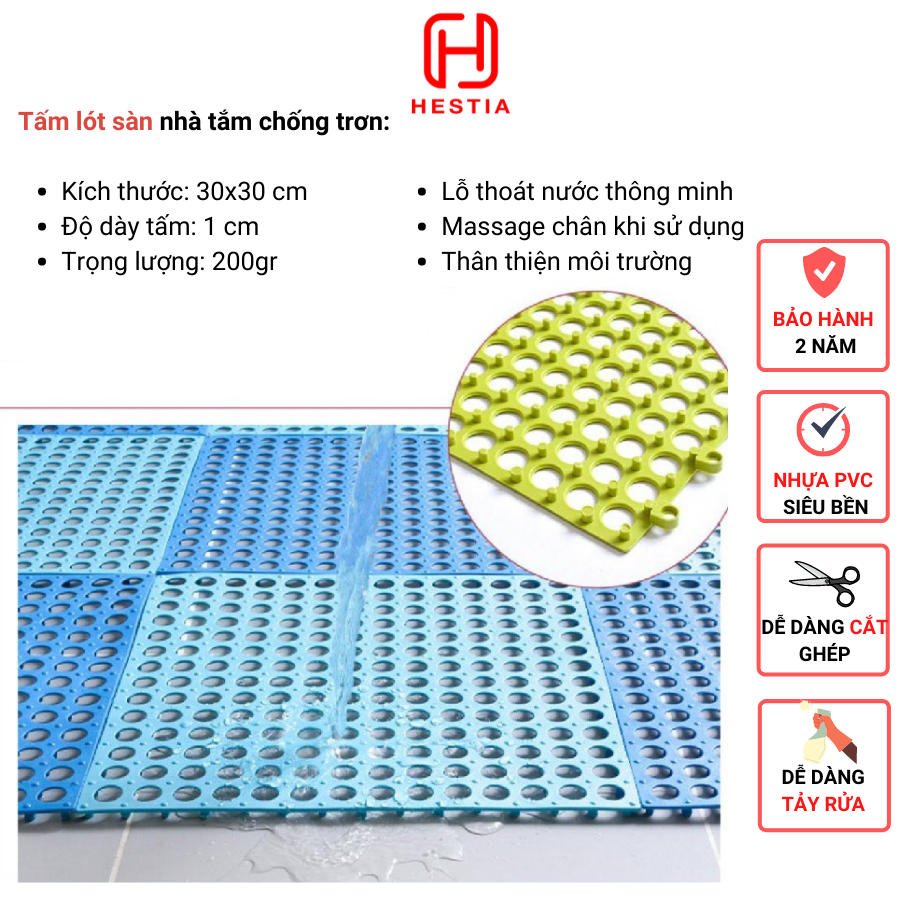 THẢM NHÀ TẮM , LÓT SÀN NHÀ TẮM , CHỐNG TRƠN NHÀ TẮM TOÀN BỘ MẪU LÀ HÌNH ẢNH THỰC TẾ CỦA SẢN PHẨM Thông số kỹ thuật : Thảm nhựa ghép kích thước tấm 3030cm . Thảm nhựa ghép có độ dày 10mm. Thảm nhựa ghép nặng 200g/ tấm Màu sắc : ghi , trắng,xanh, vàng, hồng Một lưu ý về sản phẩm Thảm nhựa chống trơn nhà tắm giá rẻ có phần lỗ tròn phân bố đều có tác dụng thoát nước nhanh giúp sàn luôn khô ráo. Cam kết hàng chính hãng gia công chuẩn chỉ sản phẩm khi xuất xưởng chất lượng luôn hoàn hảo nhất không bị lẹm góc hay ba via, thảm lỗ không quá to không gây rát chân trẻ nhỏ . Thảm nhựa ghép lỗ tròn có đặc điểm khác với những sản phẩm thảm nhựa ghép khác là : Thảm có độ mềm dẻo , độ bền cao , Thảm dễ dàng lắp ghép, Thảm đi không đau rát chân , Thảm chống rách , chống gãy Thảm nhựa ghép lỗ tròn chuyên dùng để Lắp ghép chống trơn nhà tắm nhà vệ sinh . Chống trơn cho nhà trẻ Trải khu vực để giầy dép của công nhân . Trải xung quanh bể bơi. Công thức bạn tính số lượng thảm phù hợp : ( dàirộng) / 0,09= số lượng tấm cần mua. Ví dụ : mặt sàn bạn cần đặt rộng 1,2m dài 1,5m Thì chiều dài bạn cần đặt là 5 tấm Chiều rộng bạn cần đặt 4 tấm Tổng số tấm cần mua là : 45= 20 (1,21,5)/0,09= 20 tấm hướng dẫn bạn mua hàng Bạn muốn mua 10 tấm màu trắng + 10 tấm màu ghi Bạn chọn 10 tấm màu ghi rồi cho vào giỏ hàng , sau đó bạn chọn tiếp 10 tấm màu trắng thêm vào giỏ . Như vậy bạn sẽ đặt được nhiều sản phẩm Thảm nhựa chống trơn nhà tắm giá rẻ là sản phẩm kết hợp hoàn hảo của việc chống trơn an toàn và có tính thẩm mỹ cao . Thảm có nhiều màu sắc có thể kết hợp đan xen với nhau .