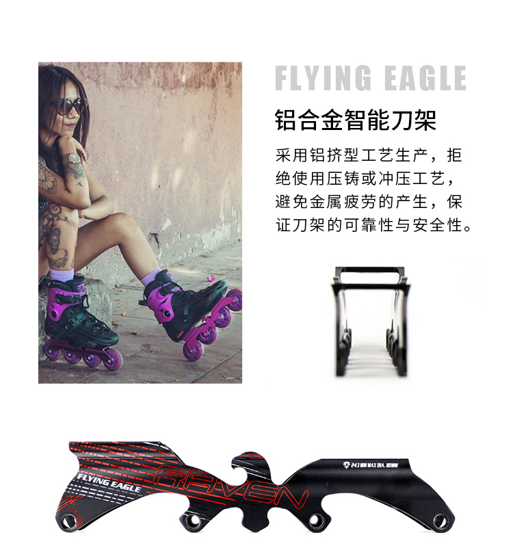– Frame: Hình chim đại bàng – Biểu tượng đặc trưng của hãng Flying Eagle với thiết kế khỏe khoắn, hiện đại và cuốn hút người nhìn. Chất liệu hợp kim Nhôm 6061 dày dặn có khả năng chịu được những cú va đập mạnh, không cong vênh, móp méo. Công nghệ CNC tạo độ sắc nét, chính xác cao, tăng tính thẩm mỹ cho đôi giày. Frame có kết hợp ốc vít lõi thép ở hai đầu có thể tháo rời, thay thế khi cần thiết chỉ bằng các thao tác vô cùng đơn giản.
