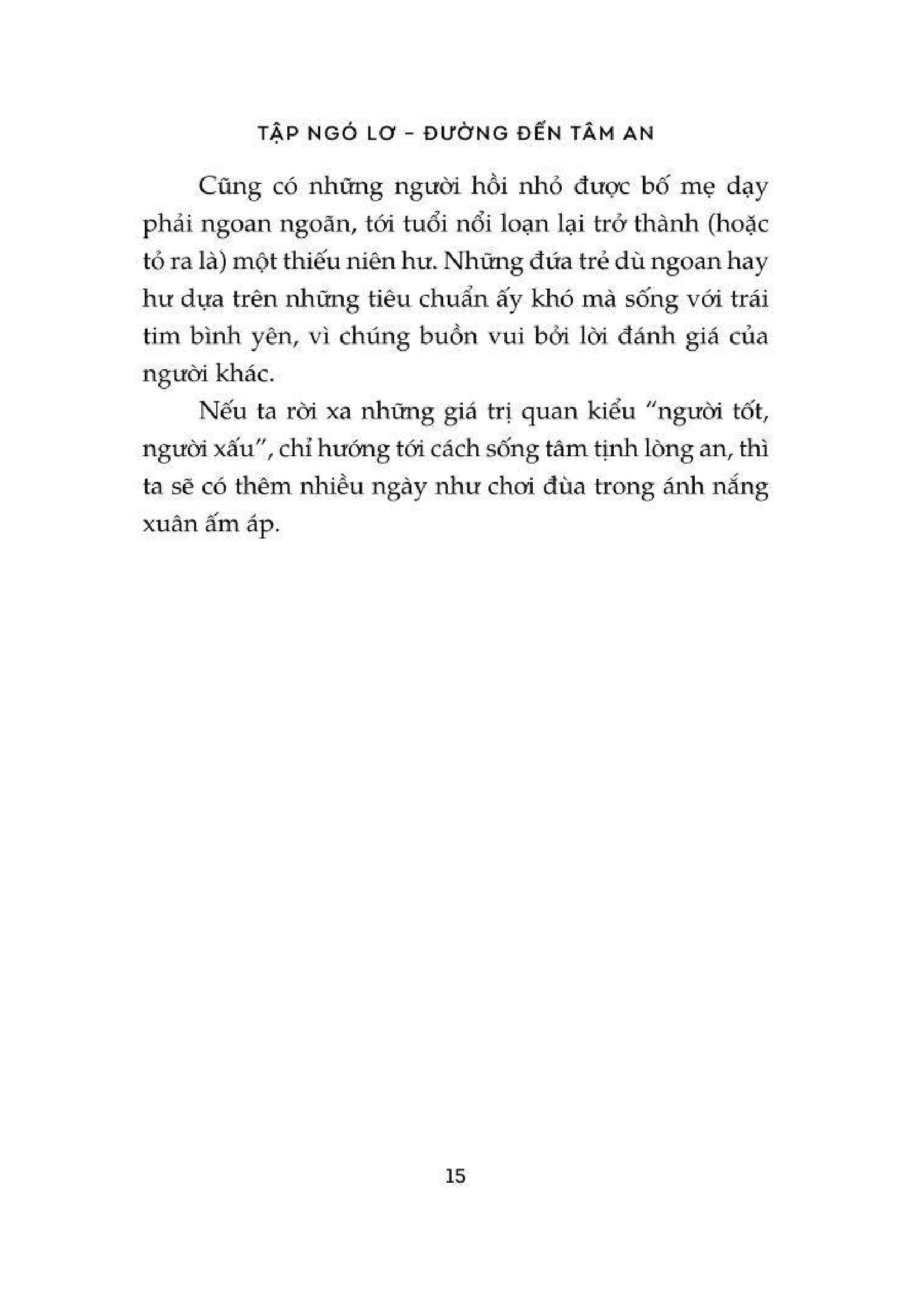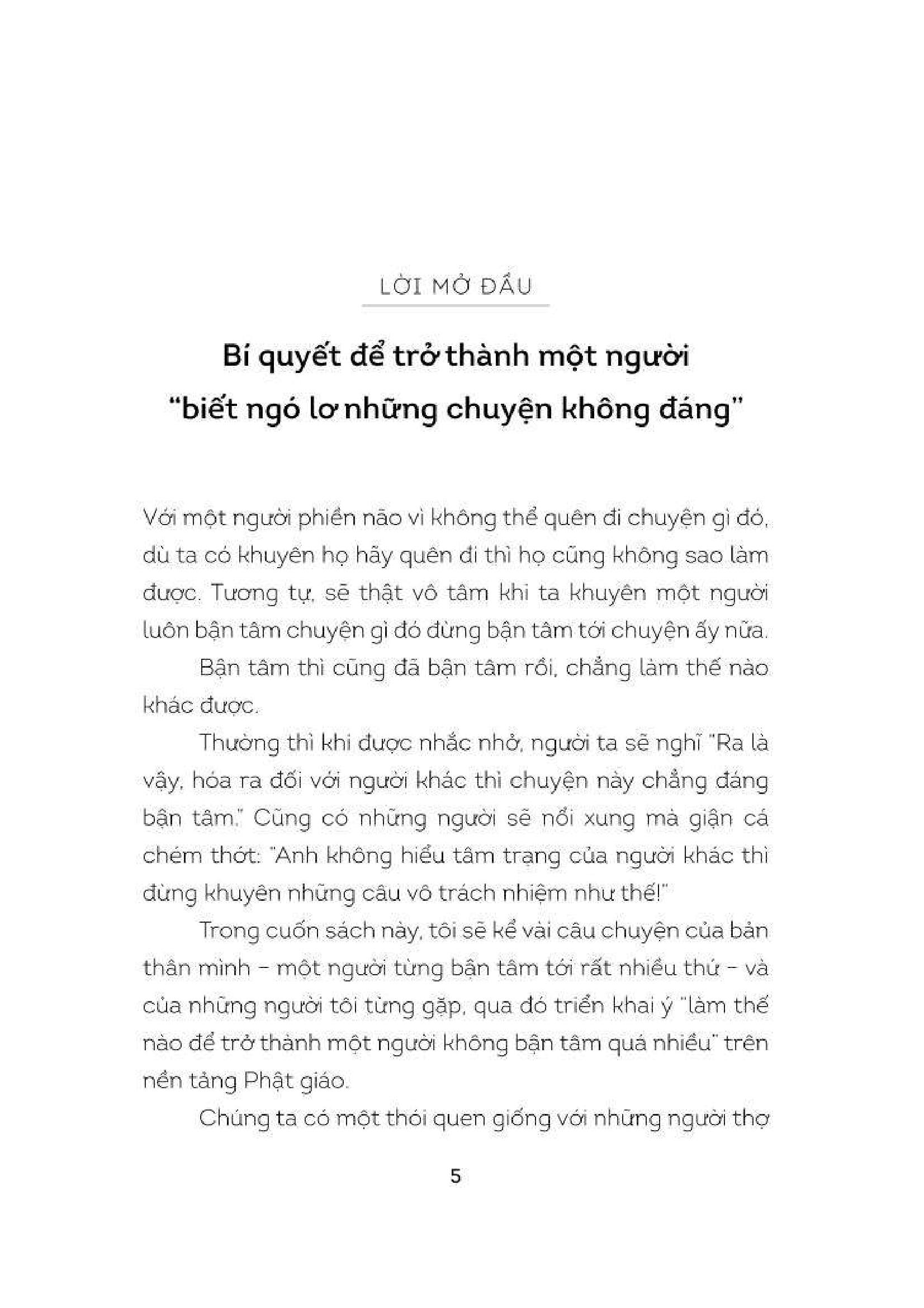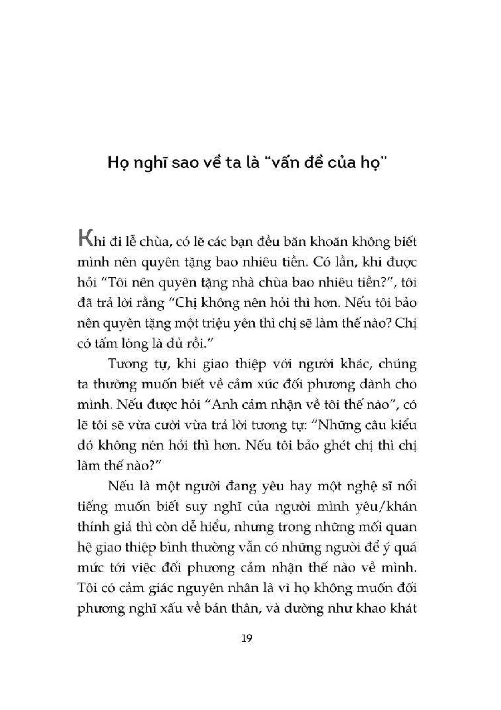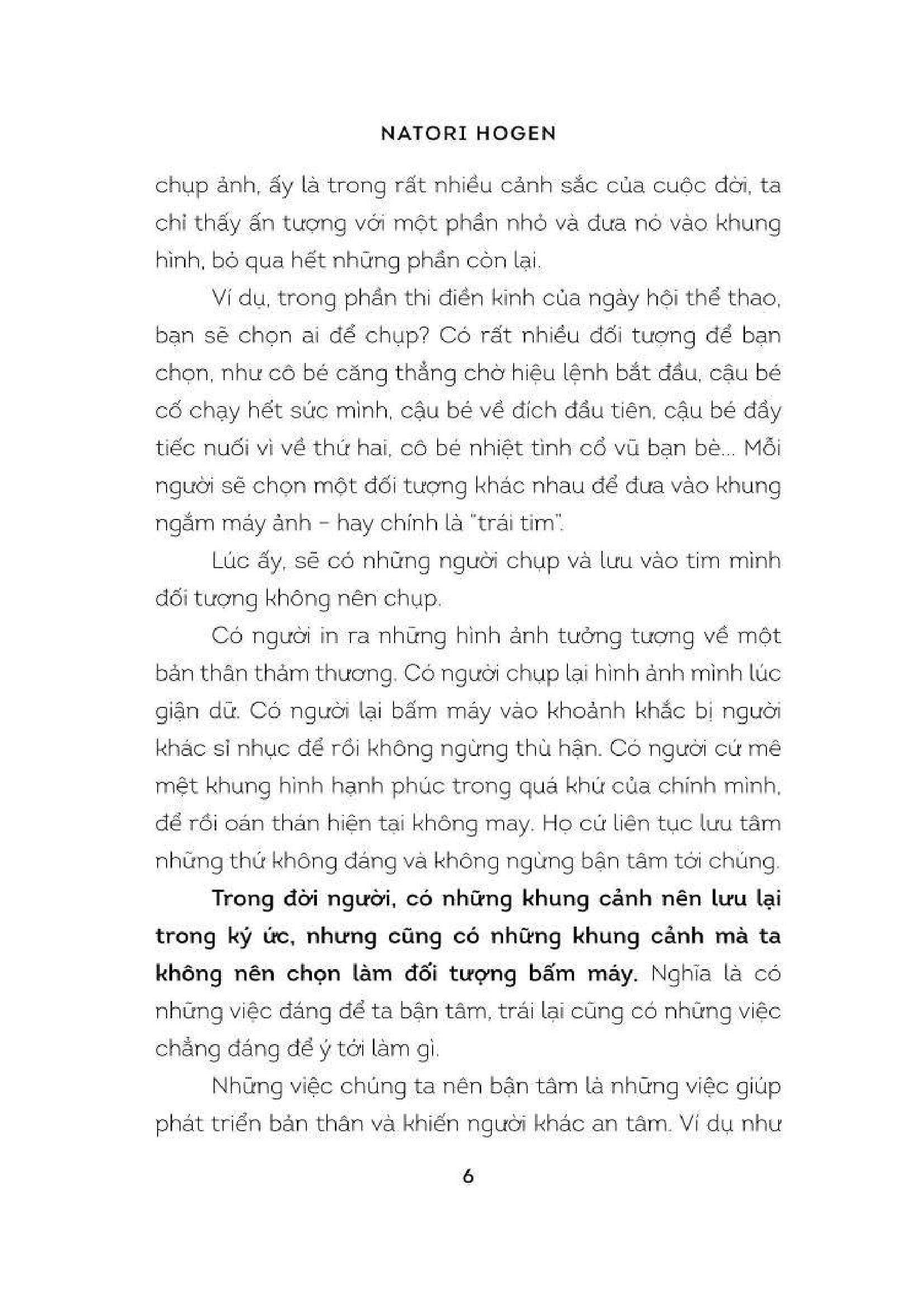 Tập Ngó Lơ - Đường Đến Tâm An Chúng ta có thói quen giống với những người thợ chụp ảnh, ấy là trong rất nhiều cảnh sắc của cuộc đời, ta chỉ thấy ấn tượng với một phần nhỏ và đưa nó vào khung hình, bỏ qua hết những phần còn lại. Có người lưu giữ hình ảnh về một bản thân thầm thương. Có người chụp lại chính m.ình lúc giận dữ. Có người cứ mê mệt khung hình hạnh phúc trong quá khứ, để rồi oán thán hiện tại không may. Mỗi người sẽ chọn một đối tượng khác nhau để đưa vào khung ngắm máy ảnh – hay chính là “trái tim m.ình”. Trong đời người, có những khung cảnh ta nên đưa vào ký ức, nhưng cũng có những khung cảnh chẳng đáng để ngoái nhìn. Cuốn sách này sẽ chỉ cách để chuyển đổi khung cảnh bạn đã chọn sai rồi khắc ghi trong tâm trí sang cảnh sắc ở một góc độ khác, đồng thời chỉ cho bạn tiêu điểm nên hướng tới trong vô vàn cảnh trí của sống. Mong sao có thể đưa bạn thoát khỏi âu sầu, tức giận, lo âu… để đón một ngày mai nắng rạng.