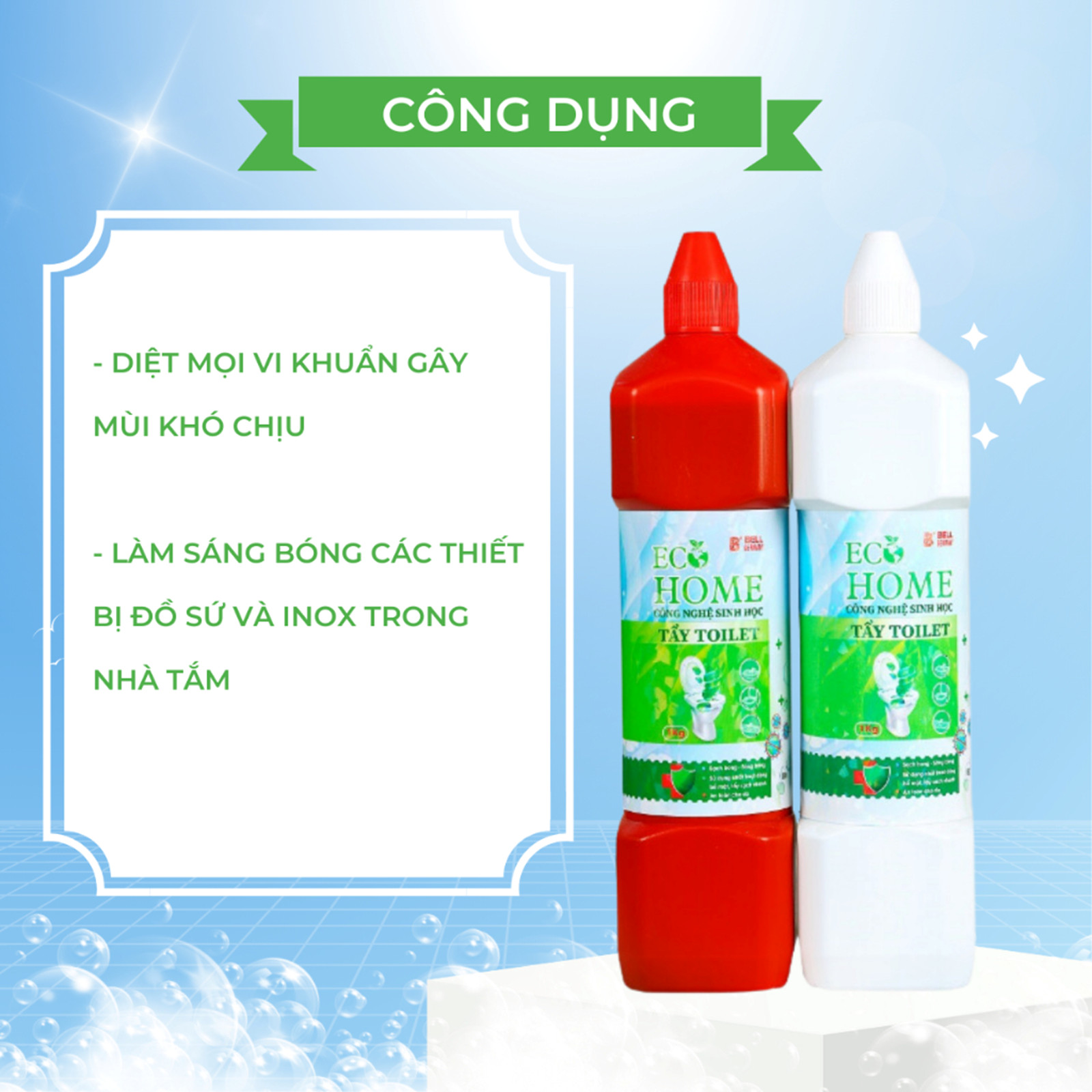 Nước tẩy bồn cầu sinh học ECO HOME tạo ra bước đột phá trong công nghệ tẩy rửa, do không phải giải phóng khí độc trong quá trình tẩy rửa nên khiến công việc tẩy bồn cầu độc hại và khó chịu ngày nào nay trở nên thật đơn giản và thoải mái; làm sáng bóng các thiết bị đồ sứ và inox trong nhà tắm. Diệt mọi vi khuẩn gây mùi khó chịu và bây giờ chẳng cần đến khẩu trang vì sợ mùi nước tẩy bồn cầu thông thường nữa.