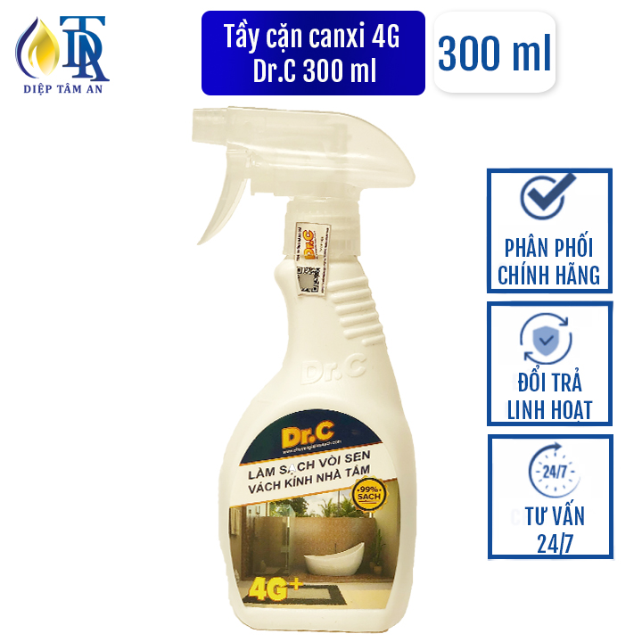 CÔNG DỤNG:Tẩy Cặn Canxi Nhà Tắm,Tẩy Vách Kính Vòi Sen Inox,Tẩy Ố Vàng Nhà Vệ Sinh Lavabo,Tẩy Rỉ Sét Inox-4G Dr.C 300ml: