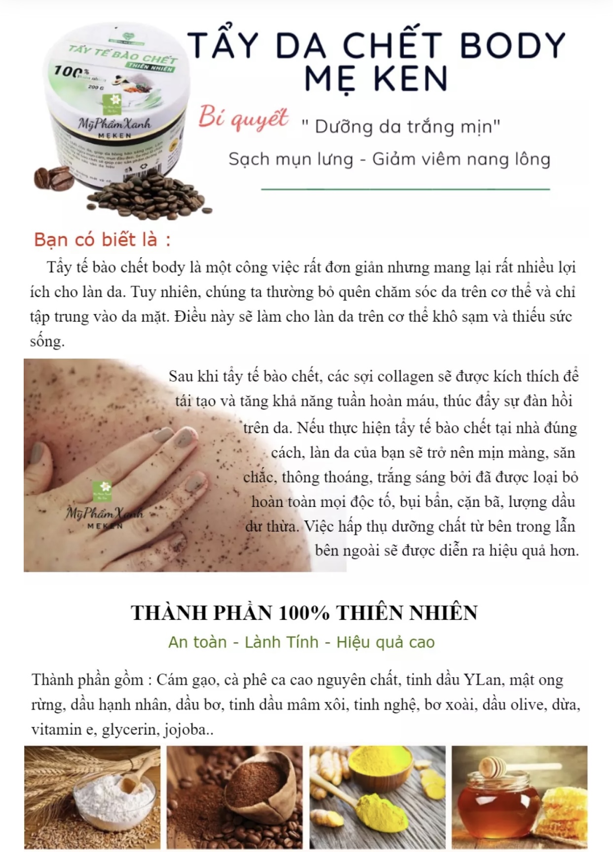 TẨY TẾ BÀO CHẾT BODY MẸ KEN *THÀNH PHẦN : cám gạo, tinh nghệ, cà phê, cacao nguyên chất, mật ong rừng, dầu hạnh nhân, dầu bơ, tinh dầu mâm xôi, dầu nho, dầu