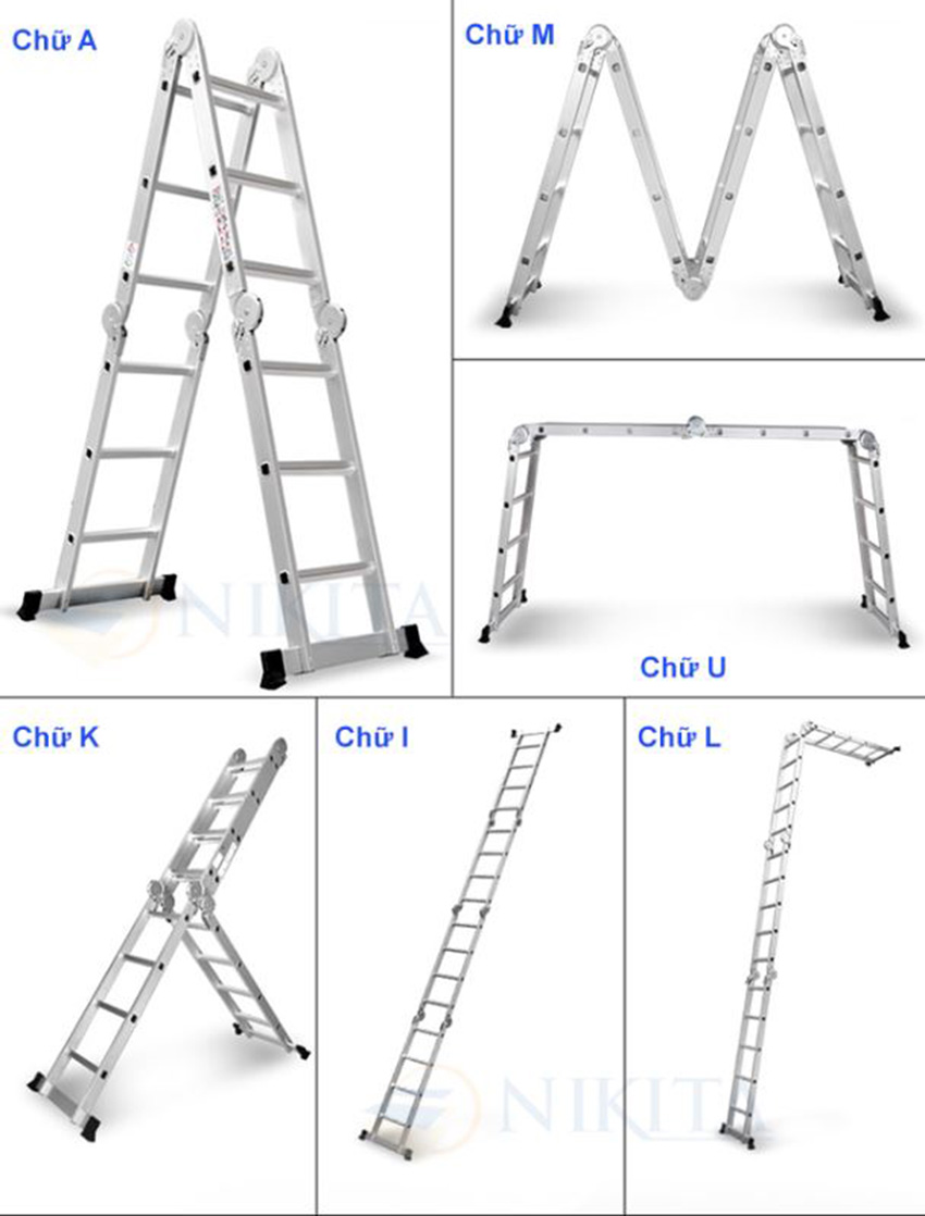 1: Thiết kế linh hoạt: Thang có thể gấp gọn lại giúp người dùng dễ dàng mang vác, di chuyển. Thang có thể sử dụng được ở nhiều vị trí khác nhau, phù hợp với nhiều công việc khác nhau.