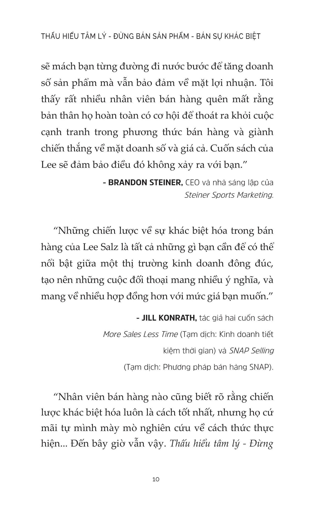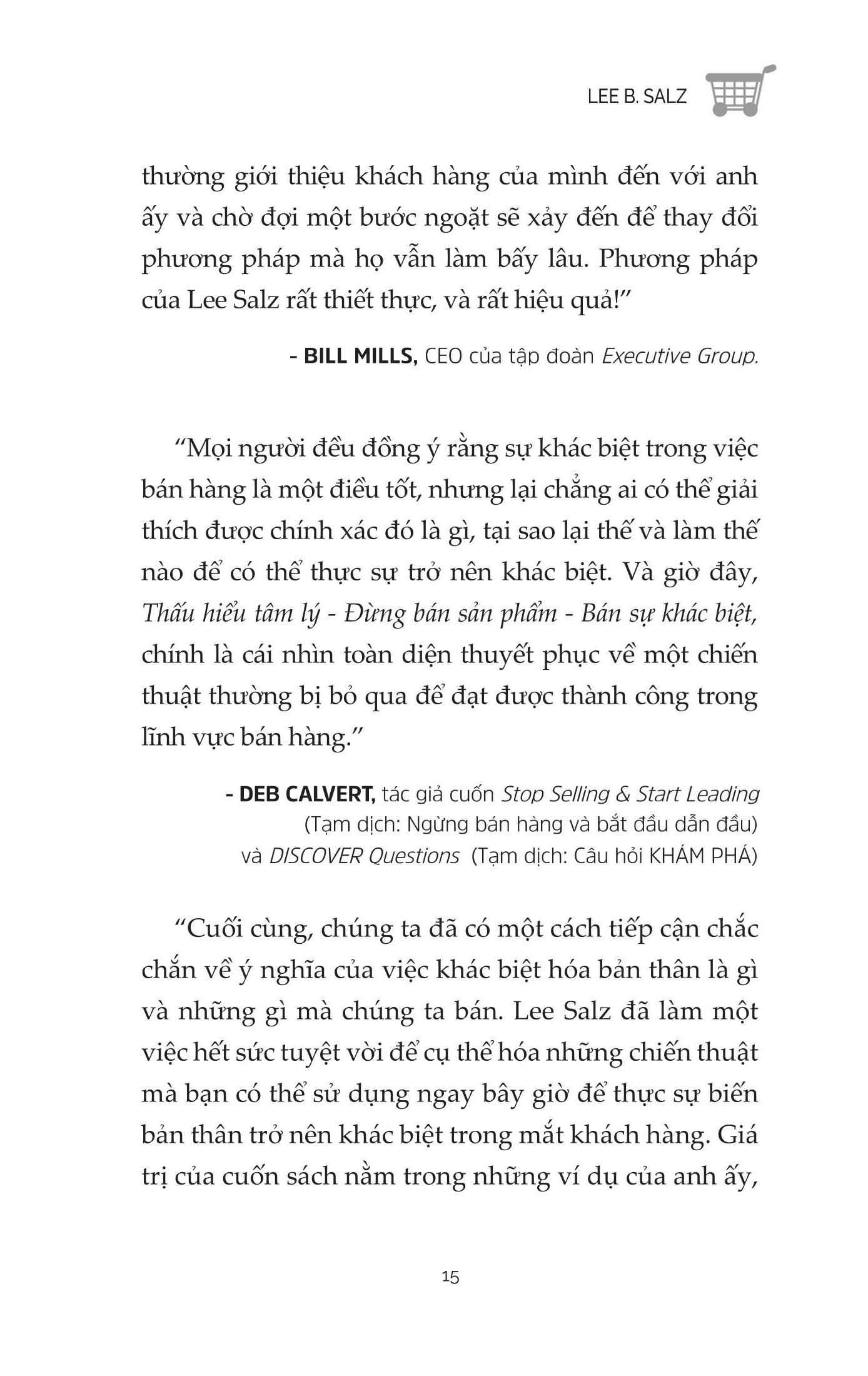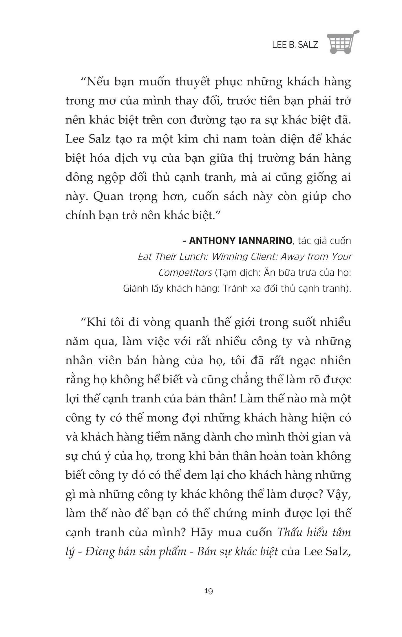 Trong cuốn sách này, chiến lược gia quản lý bán hàng, Lee B. Salz trình bày 19 khái niệm dễ thực hiện để giúp nhân viên bán hàng giành được hợp đồng trong khi vẫn bảo vệ lợi nhuận. Những khái niệm này áp dụng cho bất kỳ nhân viên bán hàng nào trong bất kỳ ngành nào và dựa trên nền tảng rằng, mấu chốt là cách bạn bán, chứ không chỉ là những gì bạn bán, hãy tạo nên sự khác biệt cho bạn.