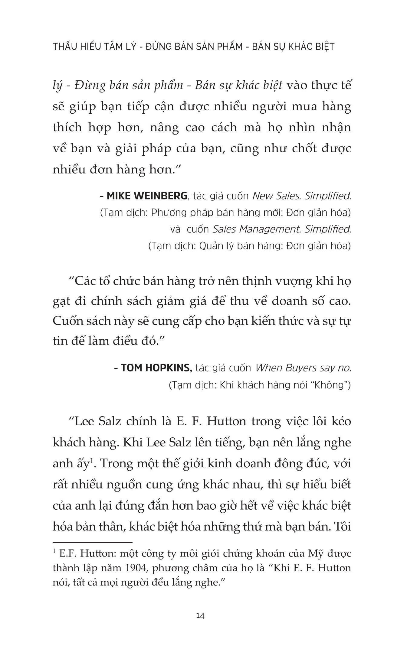 Để giành được các giao dịch ở mức giá bạn muốn, chiến lược bạn cần có là “sự khác biệt”. Hầu hết các giám đốc điều hành nghĩ rằng tiếp thị là công đoạn duy nhất tạo được sự khác biệt. Nhưng còn chức năng bán hàng của công ty thì sao? Cơ hội tạo ra khác biệt hóa thường bị bỏ qua này cung cấp vô số chiến lược để làm doanh nghiệp nổi bật so với đối thủ cạnh tranh. Và cuốn sách đột phá này sẽ dạy bạn cách phát triển những chiến lược đó.