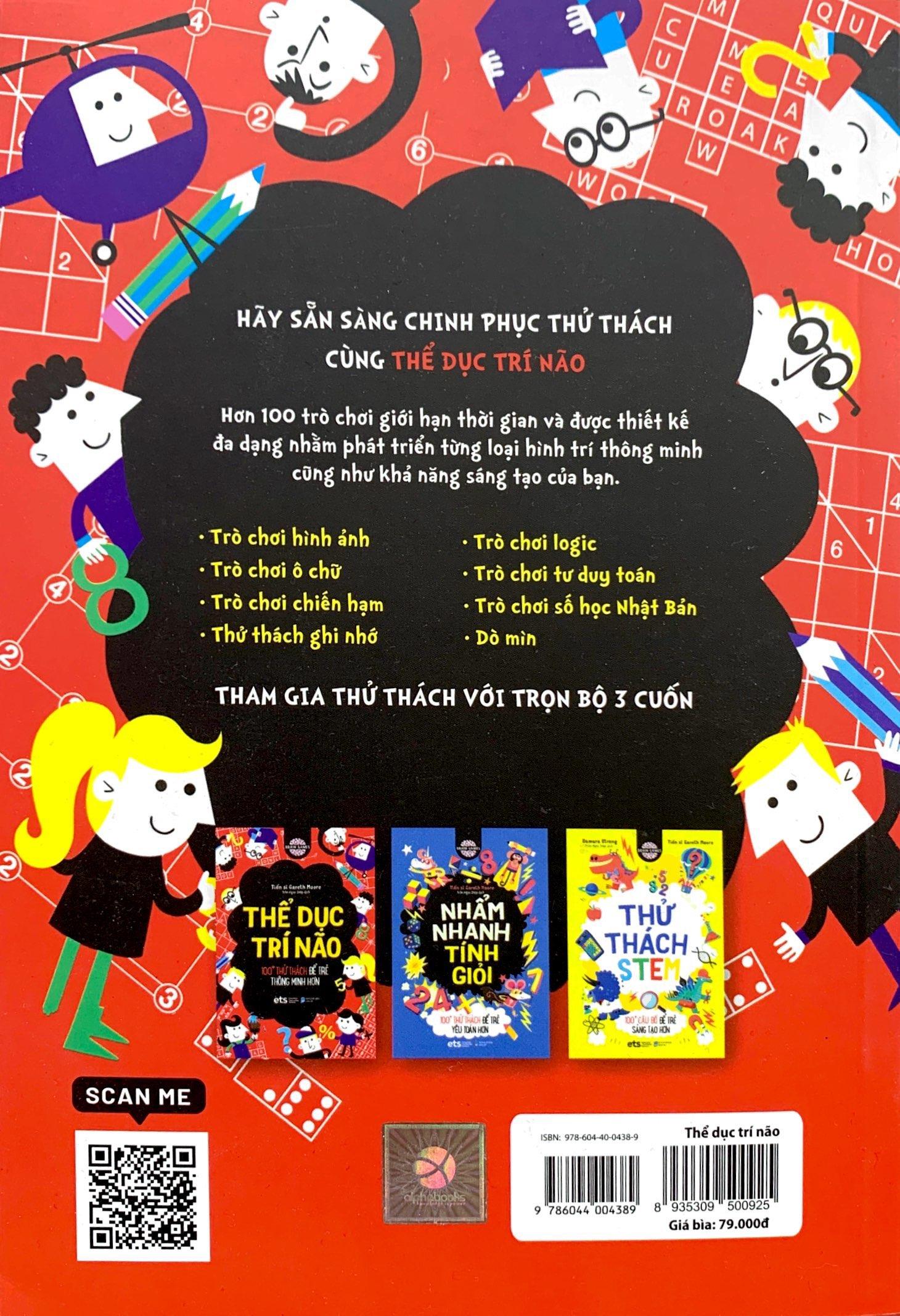 Thể dục trí não là cuốn sách về các trò chơi trí tuệ cho trẻ trên giấy bút thay vì các game trên máy tính, ảnh hưởng đến mắt trẻ ? Cuốn sách này bao gồm 101 câu đố, được thiết kế đa dạng để khám phá từng loại trí thông minh của con người, với các thể loại như giải mã, đoán số, ghép ký tự, cho đến các câu đố nổi tiếng của Nhật Bản như hanjie, kakuro, hitori, sudoku, hấp dẫn hơn bao giờ hết, kích thích tính tư duy và sáng tạo của các bạn nhỏ. Với thiết kế như vậy, các bạn sẽ được rèn luyện và phát tiển qua nhiều hoạt động tư duy: đó là khả năng quan sát, khả năng phán đoán, khả năng suy luận, khả năng ghi nhớ, cảm nhận không gian, năng lực khái quát, khả năng tưởng tượng và năng lực sáng tạo. Những bài toán giúp các em động não này có ý nghĩa lớn trong việc bồi dưỡng và nâng cao năng lực tư duy, rèn luyện cho các em khả năng giải quyết vấn đề. Đây đều là những yếu tố quan trọng hình thành và phát triển trí thông minh cho trẻ. Mỗi câu đố đều có lời giải riêng ở cuối sách, các câu đố sẽ dần dần khó hơn, câu đố khó sẽ có mẹo nhỏ trợ giúp các bạn không bị tâm lý chán nản khi không giải quyết được. Ở đầu mỗi trang sách đều có khoảng trống để các bạn viết thời gian cần thiết để hoàn thành mỗi trò chơi của trang đó. Ở cuối cuốn sách, sẽ có một số trang trống để bạn ghi lại quá trình giải đố của mình.