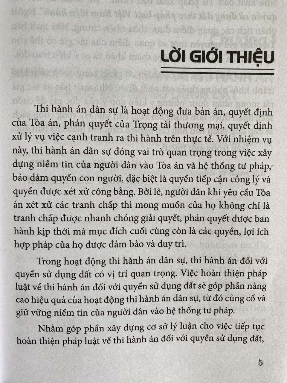 Thi hành án dân sự là hoạt động đưa bản án, quyết định của Tòa án, phán quyết của Trọng tài thương mại, quyết định xử lý vụ việc cạnh tranh ra thi hành trên thực tế. Với nhiệm vụ này, thi hành án dân sự đóng vai trò quan trọng trong việc xây dựng niềm tin của người dân vào Tòa án và hệ thống tư pháp, bảo đảm quyền con người, đặc biệt là quyền tiếp cận công lý và quyền được xét xử công bằng. Bởi lẽ, người dân khi yêu cầu Tòa án xét xử các tranh chấp thì mong muốn của họ không chỉ là tranh chấp được nhanh chóng giải quyết, phán quyết được ban hành kịp thời mà mục đích cuối cùng còn là các quyền, lợi ích hợp pháp của họ được bảo đảm và duy trì. Nhằm góp phần xây dựng cơ sở lý luận cho việc tiếp tục hoàn thiện pháp luật về thi hành án đối với quyền sử dụng đất, Nhà xuất bản Tư pháp xuất bản cuốn: "Thi hành án đối với quyền sử dụng đất theo pháp luật Việt Nam hiện hành". Ngoài phân tích các quan điểm được thừa nhận chung, Nhà xuất bản Tư pháp giữ nguyên một số quan điểm của tác giả có thể còn có ý kiến đa chiều để bạn đọc tham khảo và có ý kiến trao đổi.