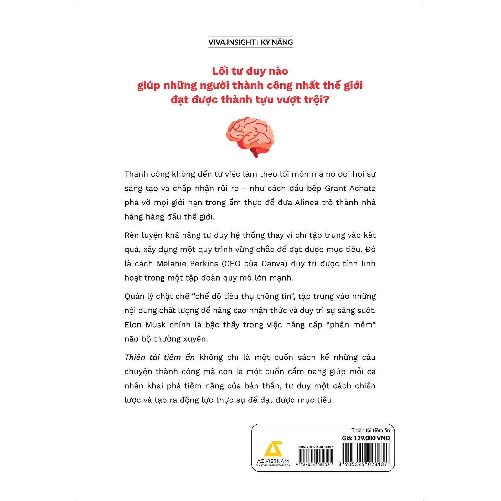 Giới thiệu sách: LỐI TƯ DUY NÀO GIÚP NHỮNG NGƯỜI THÀNH CÔNG NHẤT THẾ GIỚI ĐẠT ĐƯỢC THÀNH TỰU VƯỢT TRỘI? Thành công không đến từ việc làm theo lối mòn mà nó đòi hỏi sự sáng tạo và chấp nhận rủi ro – như cách đầu bếp Grant Achatz phá vỡ mọi giới hạn trong ẩm thực để đưa Alinea trở thành nhà hàng hàng đầu Thế giới. Rèn luyện khả năng tư duy hệ thống thay vì chỉ tập trung vào kết quả, xây dựng một quy trình vững chắc để đạt được mục tiêu. Đó là cách Melanie Perkins (CEO của Canva) duy trì được tính linh hoạt trong một tập đoàn quy mô lớn mạnh. Quản lý chặt chẽ “chế độ tiêu thụ thông tin”, tập trung vào những nội dung chất lượng để nâng cao nhận thức và duy trì sự sáng suốt. Elon Musk chính là bậc thầy trong việc nâng cấp “phần mềm” não bộ thường xuyên. Thiên tài tiềm ẩn không chỉ là một cuốn sách kể những câu chuyện thành công mà còn là một cuốn cẩm nang giúp mỗi cá nhân khai phá tiềm năng của bản thân, tư duy một cách chiến lược và tạo ra động lực thực sự để đạt được mục tiêu. MỤC LỤC: CHƯƠNG 1: Giải phóng tiềm năng sáng tạo CHƯƠNG 2: Làm chủ sức mạnh tinh thần CHƯƠNG 3: Mở khóa những mối quan hệ lành mạnh CHƯƠNG 4: Kể những câu chuyện hấp dẫn hơn CHƯƠNG 5: Trở thành một nhà lãnh đạo hiệu quả hơn CHƯƠNG 6: Chấp nhận rủi ro trong những thời điểm không chắc chắn CHƯƠNG 7: Làm sáng tỏ suy nghĩ CHƯƠNG 8: Xây dựng một cộng đồng gắn kết CHƯƠNG 9: Tối ưu hóa thực đơn nội dung CHƯƠNG 10: Khám phá thiên tài tiềm ẩn bên trong bạn"