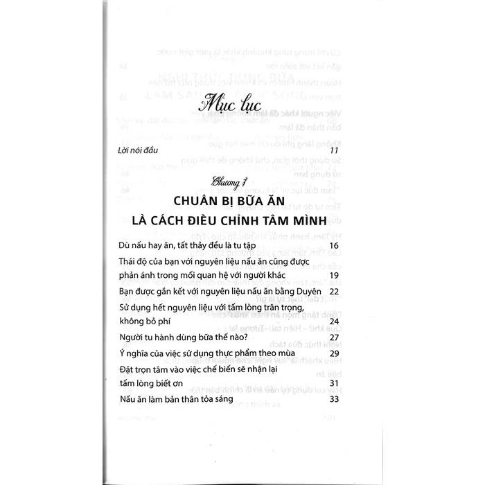 Nấu ăn và ăn. Những hoạt động đó ẩn chứa nhiều lời dạy, thực tiễn của Thiền. Hãy thử nhìn lại một chút quá trình nấu ăn, thử một lần nữa xem xét lại cách ăn. Những việc đó chính là cách chạm đến thế giới của Thiền tự nhiên nhất. Hơn thế, trong hành động ăn uống tồn tại “bản chất” của Thiền. Cuốn sách sẽ hướng dẫn bạn cách hướng dẫn Nấu ra sao, Ăn như thế nào theo phong cách thiền, bắt đầu mỗi ngày bằng năng lượng tươi sáng bằng bữa ăn đậm chất Thiền.